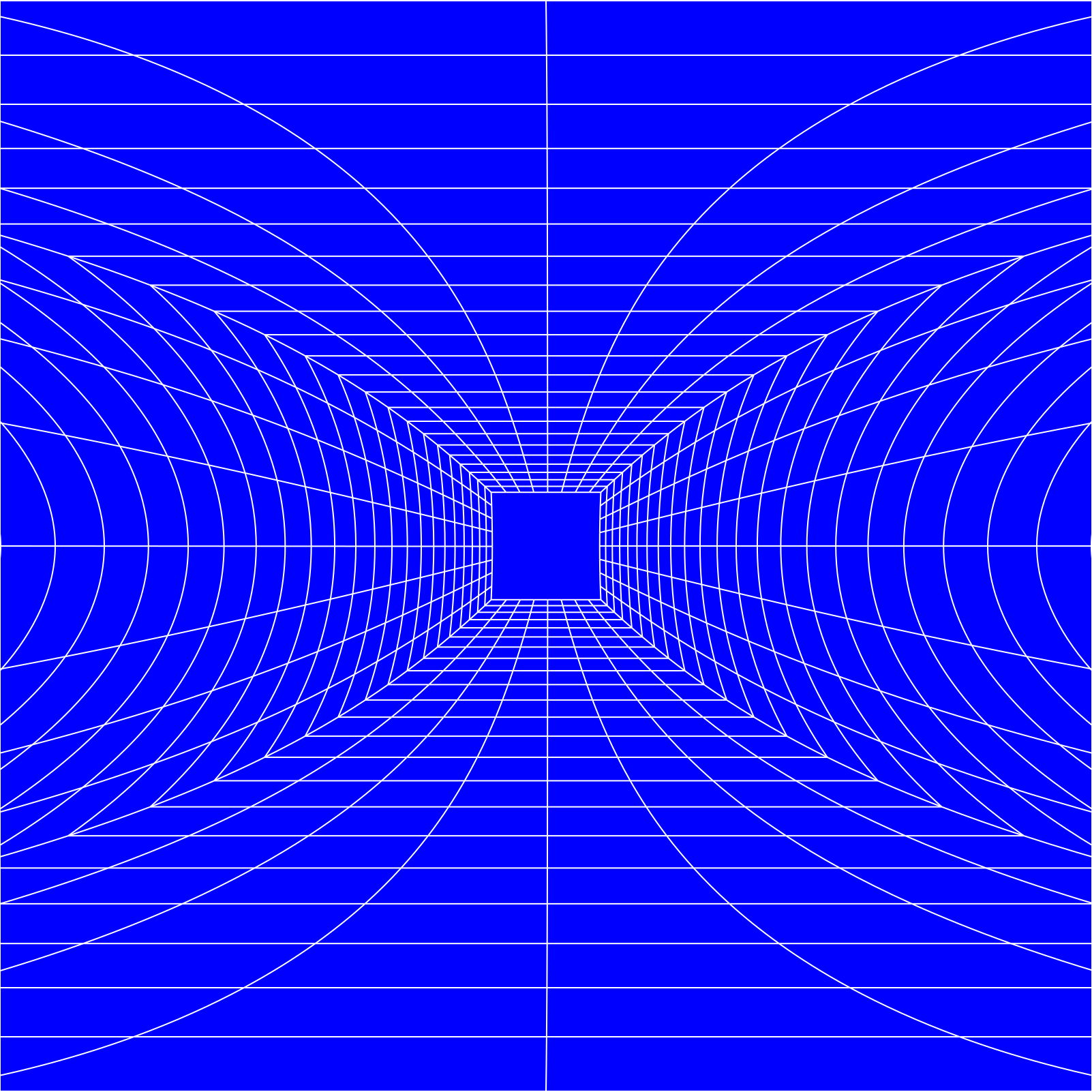 This is a blue, distorted perspective grid with a square pattern. It appears to be an artistic representation of a three-dimensional space, possibly a tunnel or a room. The grid has a unique design that gives it a distinctive appearance. The blue color adds depth and intrigue to the scene, making it visually appealing. This image could be used for various purposes such as decoration, artwork, or even in architectural designs.