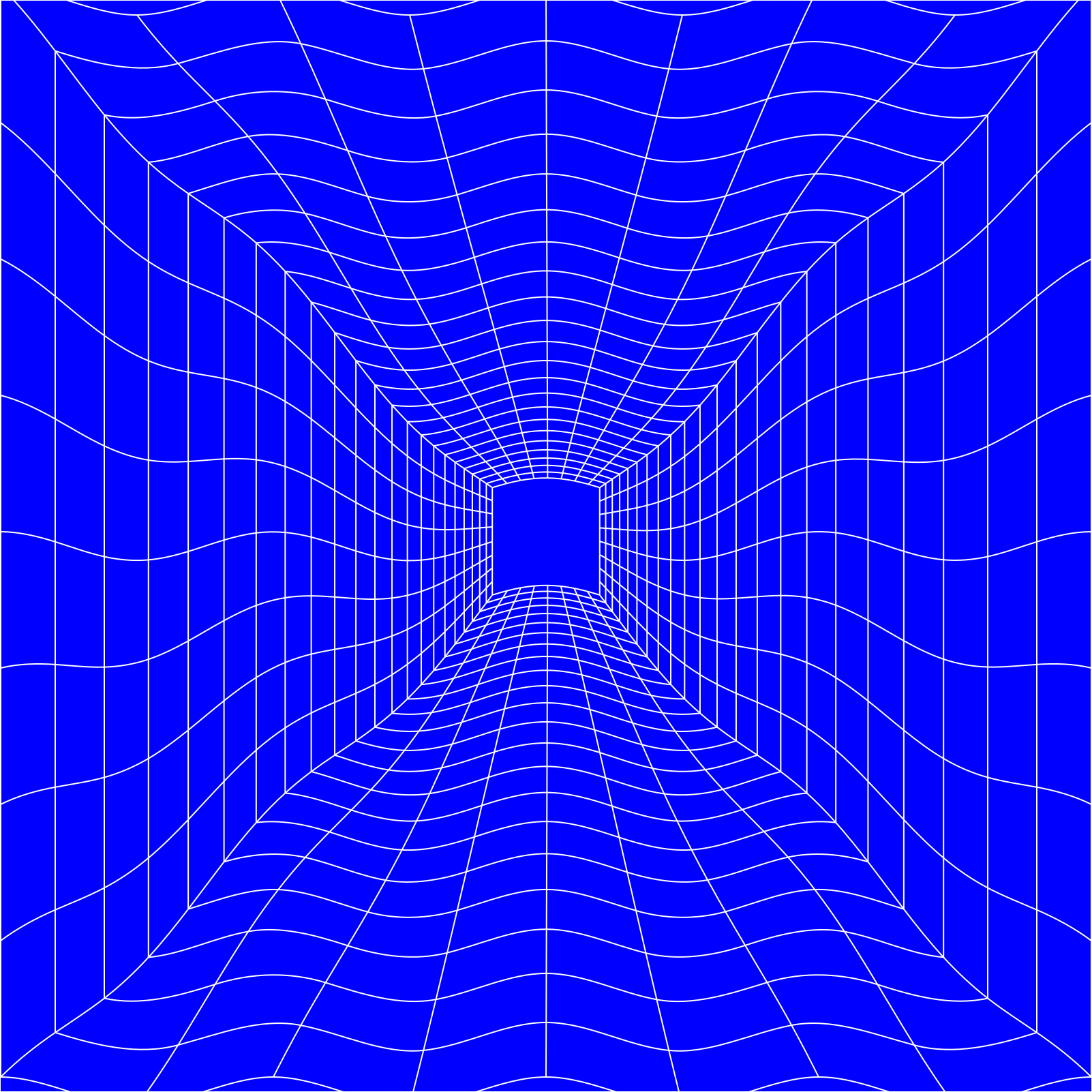 This is a blue, three-dimensional tunnel that appears to be made of glass. It has an interesting perspective and gives the impression of being inside a large tube or pipe. The tunnel's walls are covered in a grid pattern, which adds depth and complexity to the scene. The overall effect is a visually striking and unique representation of a tunnel-like structure.