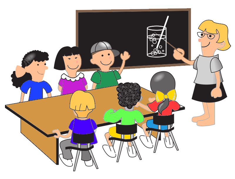 This depicts a classroom setting with a teacher standing in front of a blackboard, teaching her students. There are several children sitting at a wooden table, attentively listening to the lesson. In addition to the students and the teacher, there is also a cup placed on the table. The scene appears to be a cartoon illustration, capturing the essence of a typical classroom environment with an emphasis on learning and education.