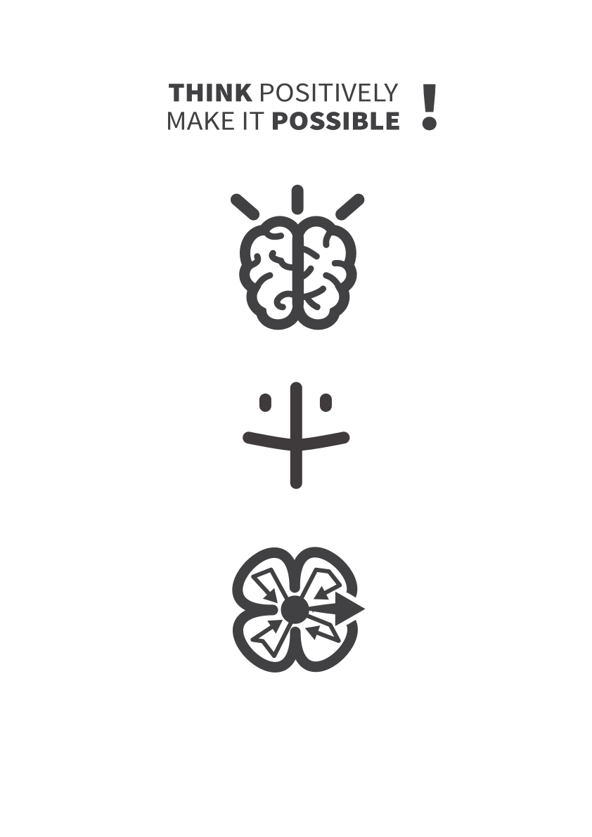 This features a series of three symbols, each representing a different concept. The first symbol is an outline of a brain, which signifies the importance of thinking positively and making it possible to achieve one's goals. The second symbol is a heart, symbolizing love and compassion, which can help in creating a positive environment for success. Finally, the third symbol is a circle with an arrow pointing upwards, representing the idea that by focusing on the possibilities rather than limitations, one can make their dreams come true. These symbols are arranged in a row, emphasizing the interconnectedness of these concepts and the importance of incorporating them into daily life for achieving success.