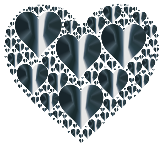 This features a heart-shaped design made up of multiple smaller hearts. These hearts are arranged in various sizes and shapes, creating an intricate pattern that resembles a broken heart. The overall appearance is quite unique and visually appealing. The hearts are black in color, which adds to the striking visual effect created by their arrangement.