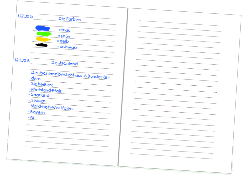 This features a notebook in German, which is open to the first page. On this page, there are several lists of names and locations written out in blue. Some of these locations include "Deutschland," "Bundestand," "Die Welt," "Santland," "Westerweiten," and "Nord." The notebook appears to be a useful tool for organizing information or keeping track of important details related to these places.