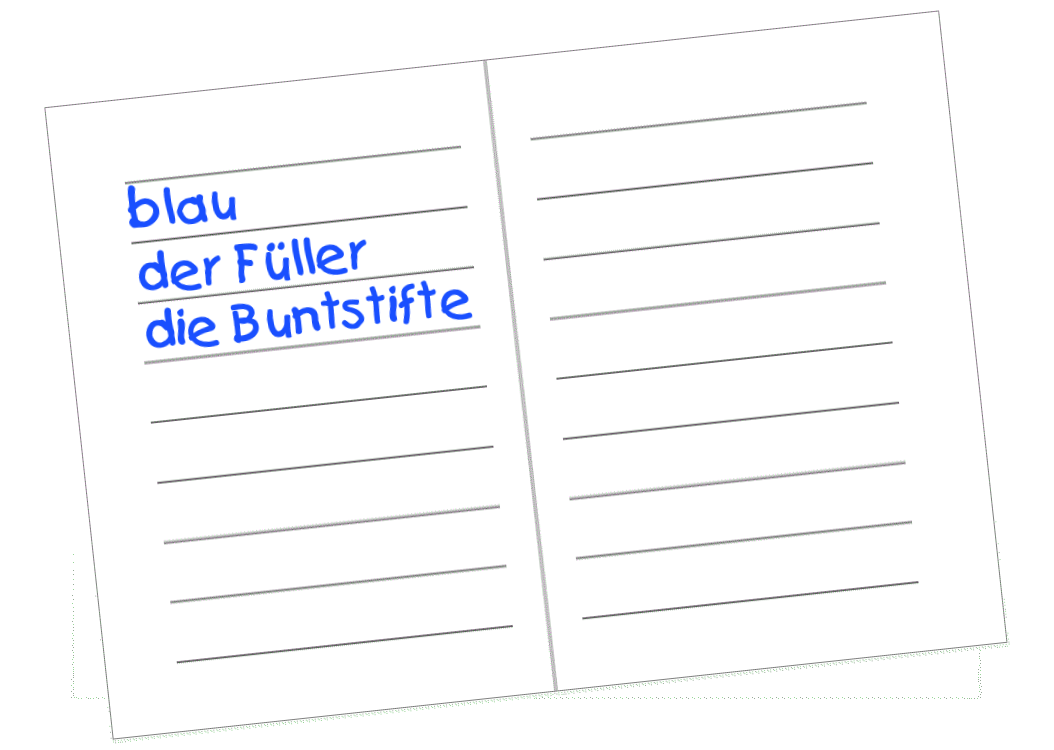 This features a book with the title "Blü der Fille der Filder Die Buntstifte" written in German. This book appears to be a notebook or a diary, as it has pages for writing and is bound together. The text on the cover of the book is written in blue, which adds an interesting visual element to the overall design.