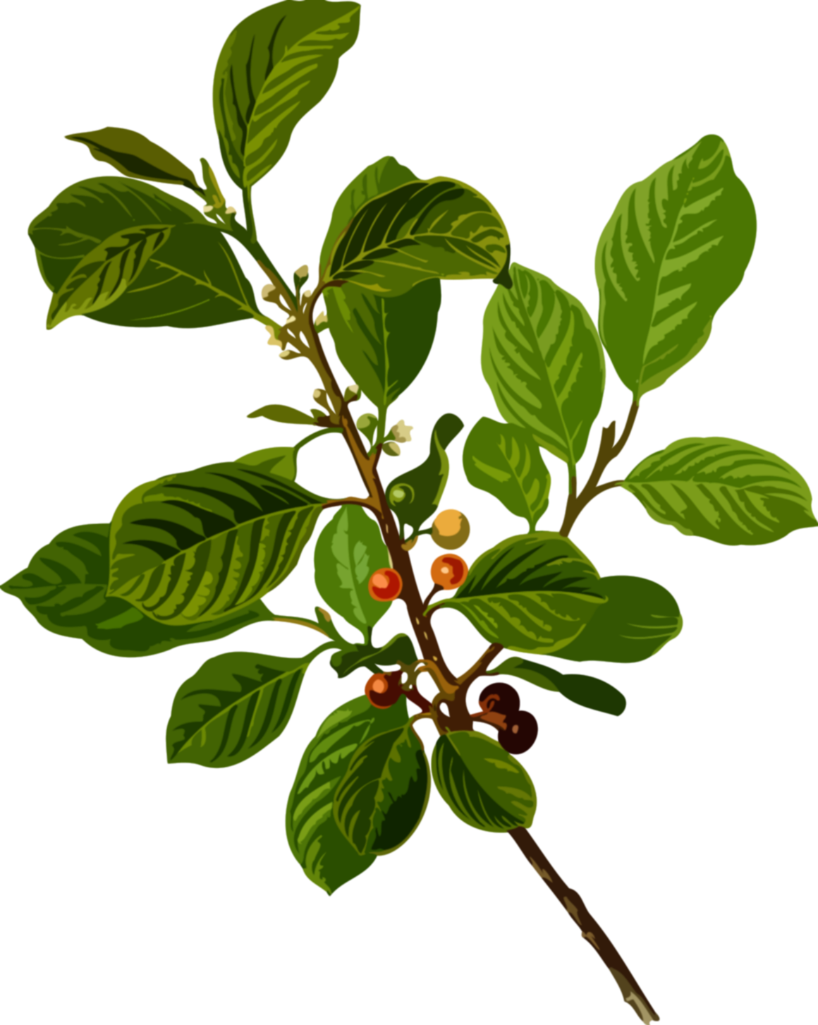 This features a close-up of a tree branch with green leaves and berries. There are several berries scattered throughout the branches, some hanging from the top while others are positioned closer to the bottom. The overall scene is vibrant and colorful, showcasing the natural beauty of the tree and its fruit.