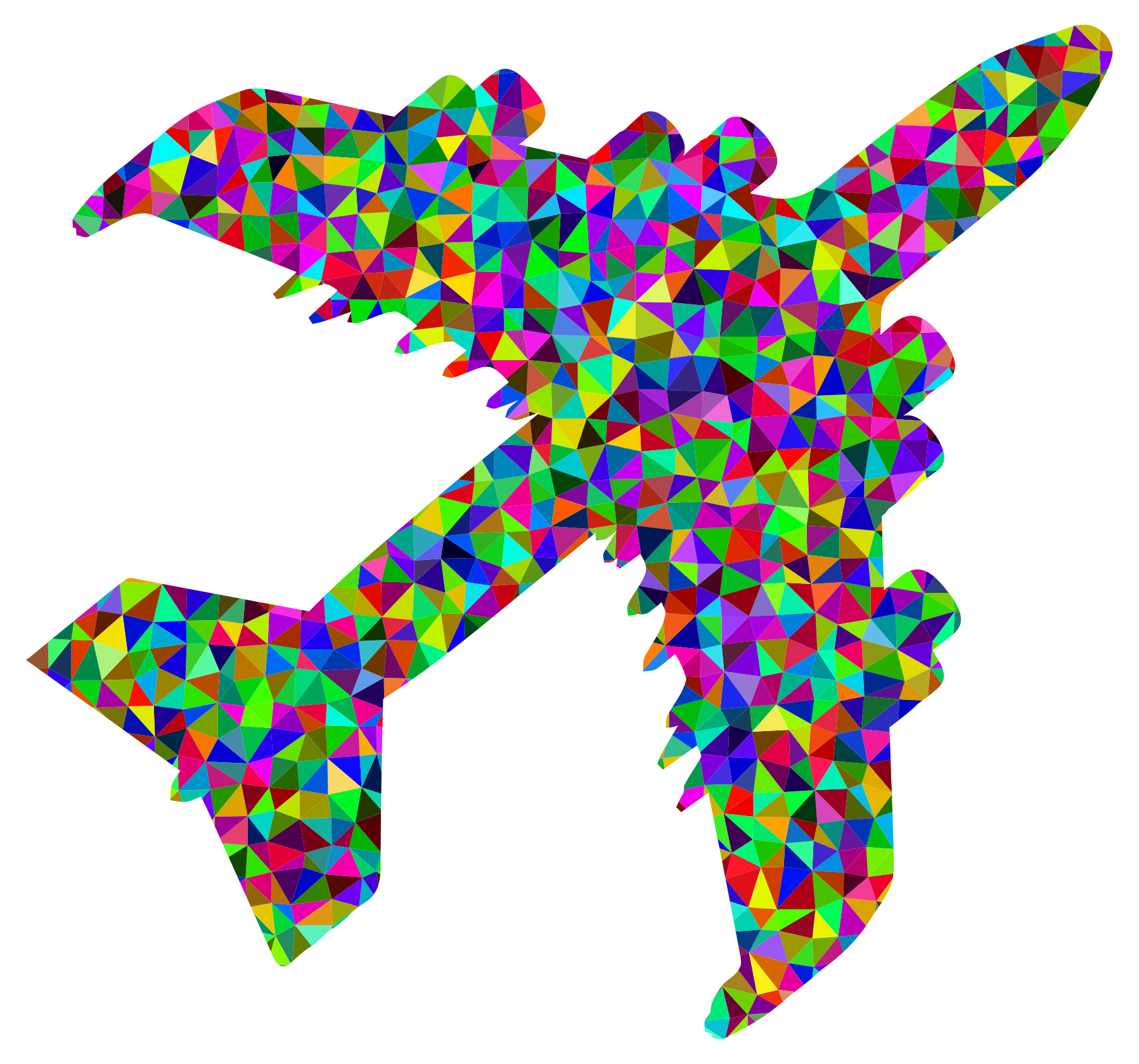 This features a colorful, low-poly representation of an airplane. This artistic depiction is made up of various colored triangles and squares that create the illusion of a three-dimensional object. The plane's wings are prominently displayed in the foreground, while its body occupies most of the background. The vibrant colors and geometric shapes make this image visually appealing and unique.