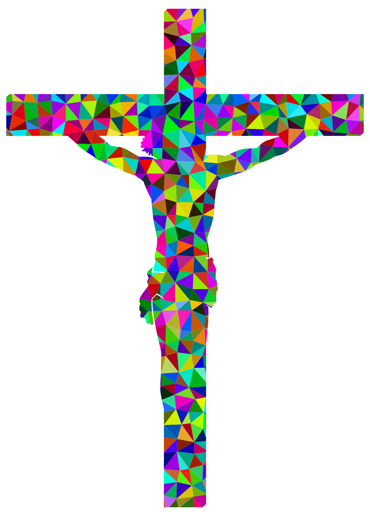 This features a colorful, pixelated representation of Jesus on the cross. This artistic depiction is made up of various colored squares and triangles that create an intricate pattern around the figure of Christ. The colors used in this design are predominantly red, green, blue, yellow, and orange, giving it a vibrant and lively appearance. The image captures the essence of Jesus' sacrifice while showcasing the creativity behind its pixelated presentation.