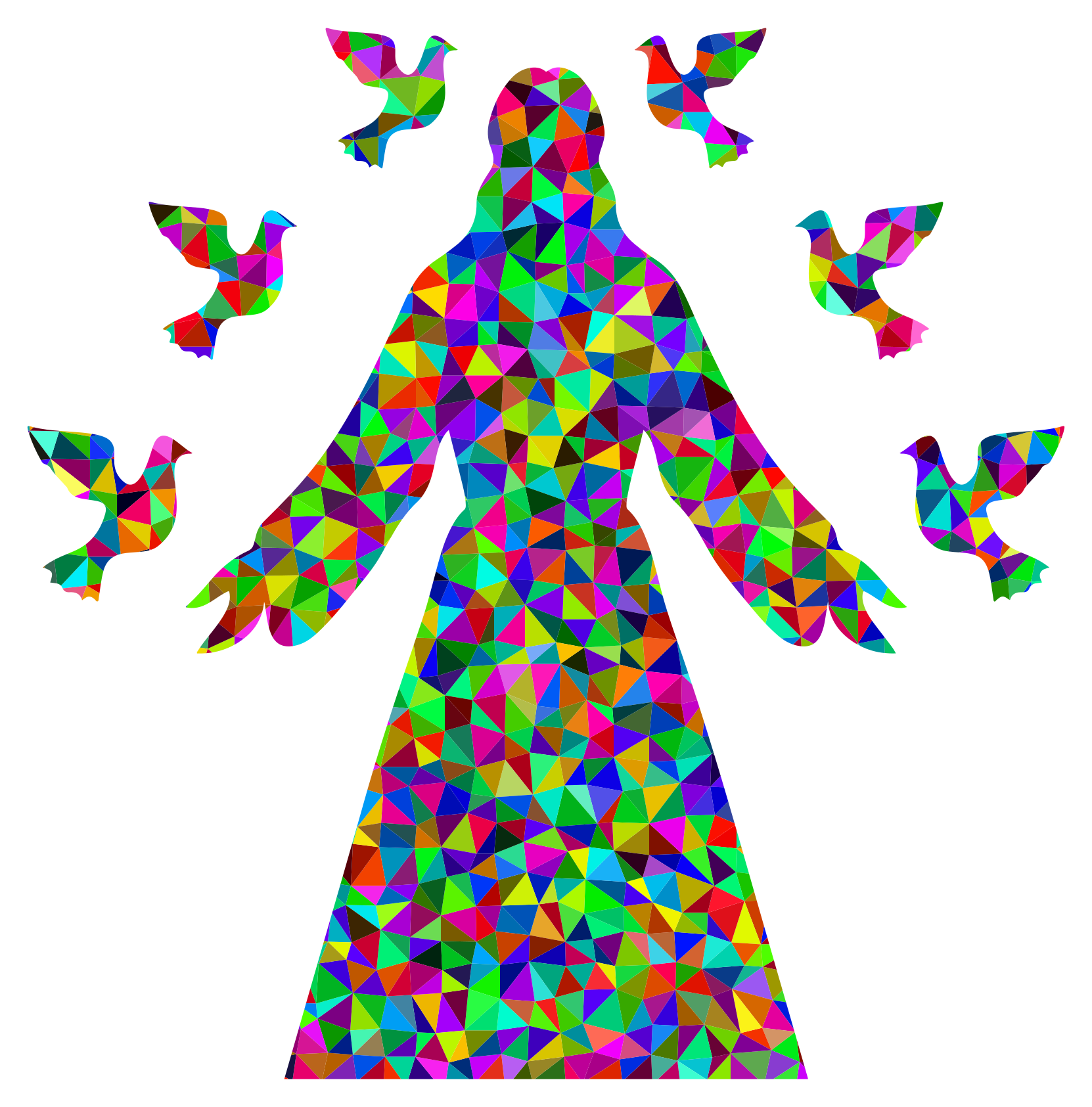 This features a colorful and artistic representation of a woman, possibly an angel or a goddess. She is surrounded by various birds in different colors, creating a vibrant and lively scene. There are at least 13 birds visible in the picture, with some positioned close to her body while others are scattered around her. The combination of the woman's figure and the multitude of birds creates an intriguing and visually appealing image that captures attention.