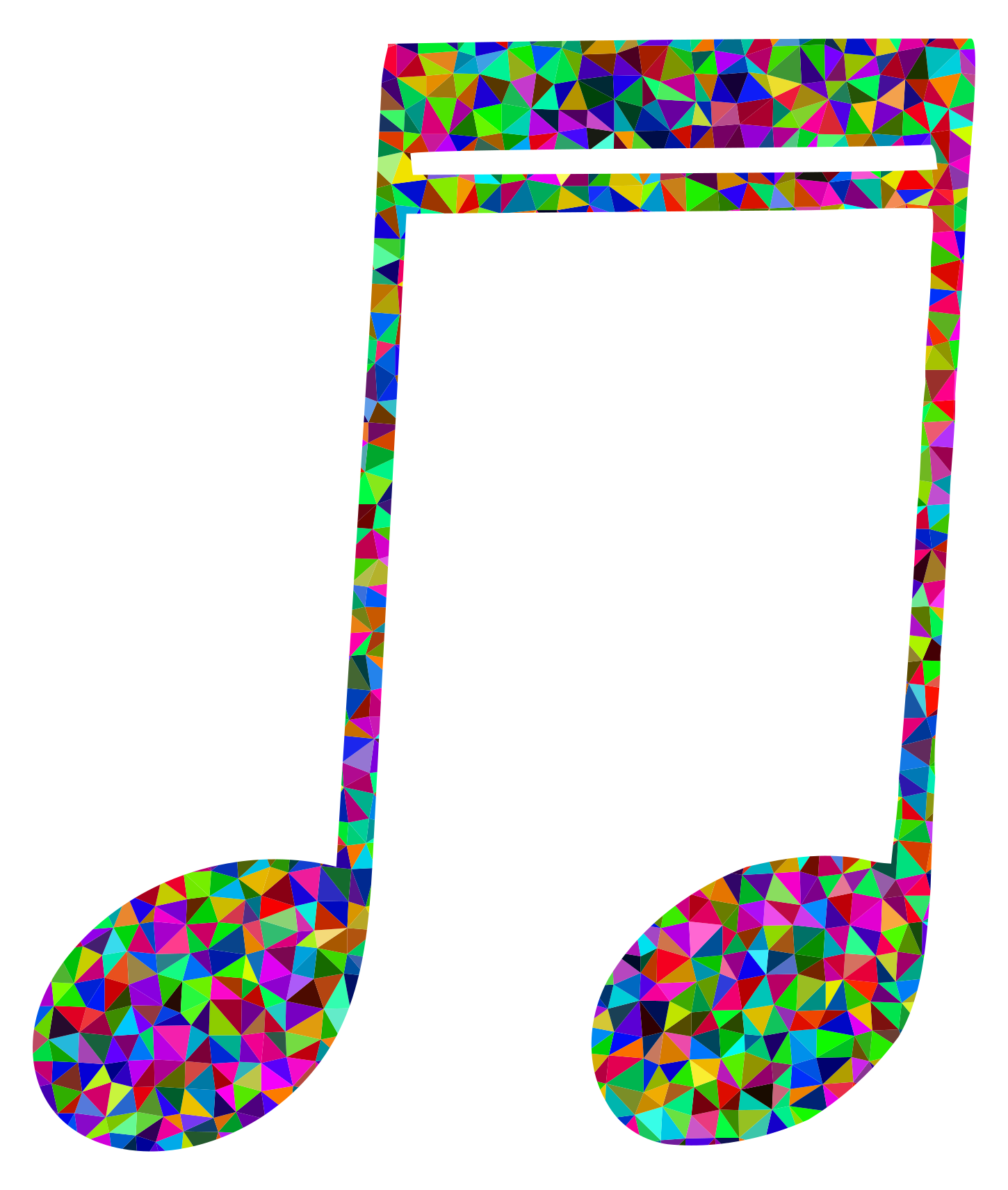 This features a colorful, low-poly representation of a musical note. This unique design is made up of various colors and shapes that create an eye-catching pattern. The note itself appears to be a combination of different colored squares, with some sections being more prominent than others. Overall, the visual effect is striking and captivating, making it an interesting piece of art or decoration for any space.