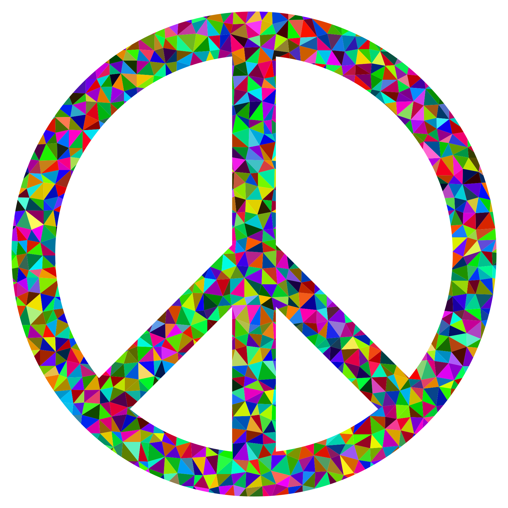 This features a colorful, low-poly peace sign made up of various colored triangles. The peace sign is composed of different shades and hues of red, green, blue, yellow, orange, purple, pink, and white. These colors are arranged in such a way that they create an eye-catching and vibrant design. The combination of these bright colors gives the image a lively and cheerful appearance, making it an attractive visual representation of peace.