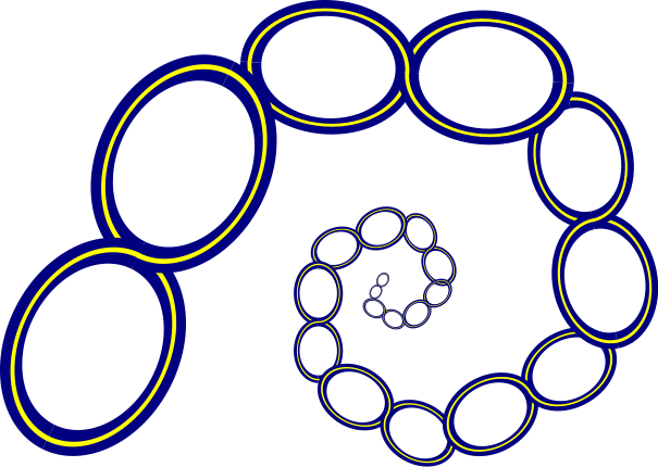 This features a blue and yellow spiral made up of circles. These circles are arranged in a circular pattern, creating an intricate design that resembles an infinity symbol. Each circle is outlined with black, adding depth to the overall appearance of the spiral. The combination of colors and the arrangement of the circles make this image visually appealing and captivating.