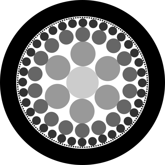 This features a black and white circle with a large, central gray circle. Surrounding the central circle are numerous smaller gray circles, creating an intricate pattern. This design gives the impression of a close-up view of a circular object, possibly a wheel or a piece of artwork. The combination of the central gray circle and the surrounding smaller circles creates a visually appealing and unique composition.
