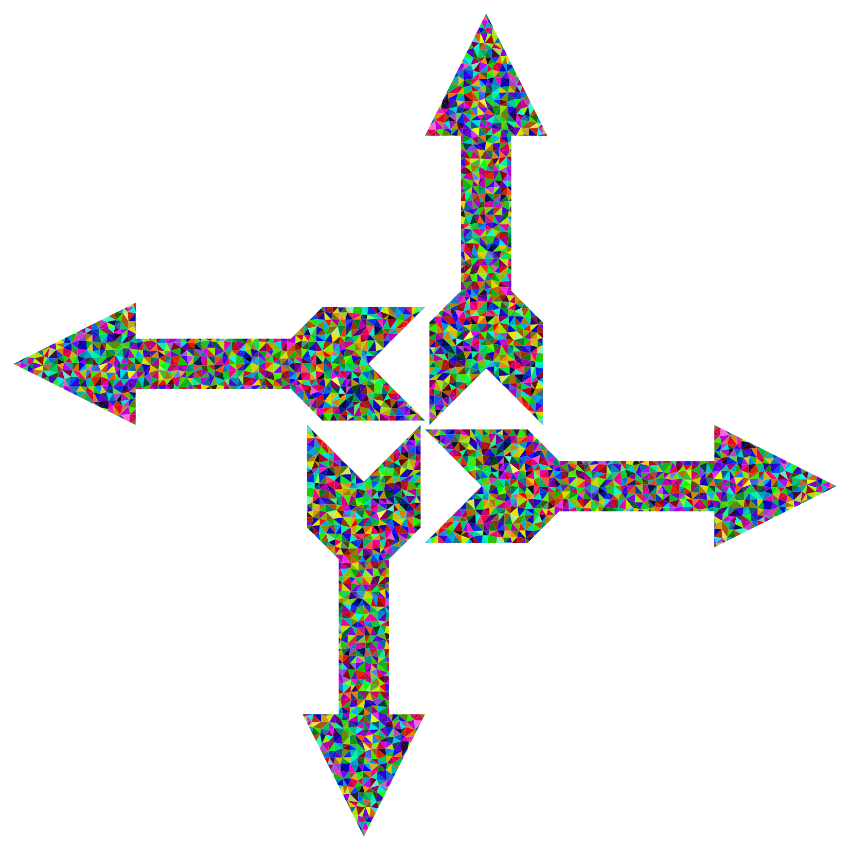 This features a colorful, low-poly artwork of an arrow pointing in four different directions. Each direction is represented by a unique color and design, creating a visually appealing and vibrant display. The arrow's shape is composed of multiple triangles, which are arranged to form the overall structure of the image. This creative piece of art showcases the artist's skill in combining various colors and shapes into a cohesive and eye-catching design.