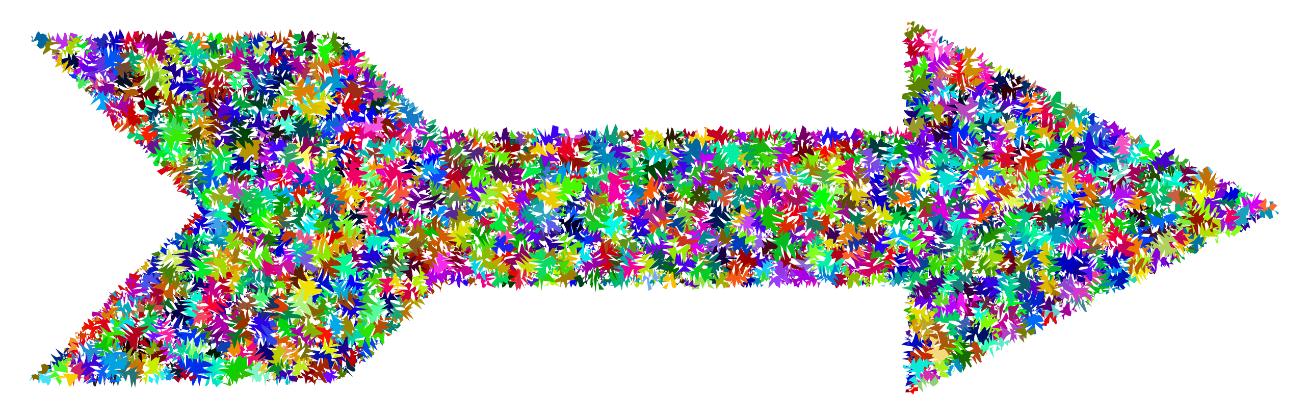 This features a unique and colorful arrow pointing to the right. The arrow is made up of various colored shapes, creating an interesting visual effect. These colors are scattered throughout the entire length of the arrow, making it stand out as a vibrant and eye-catching design. This creative representation of an arrow adds a touch of artistic flair to its otherwise simple concept.
