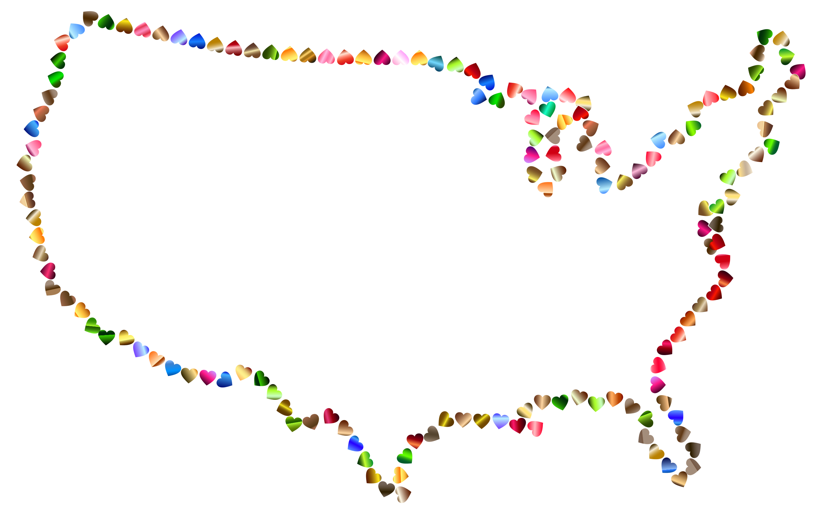 This features a creative and colorful representation of the United States, made up of hearts. These hearts are arranged in various shapes and sizes to form the outline of the country. They are scattered across the entirety of the map, with some hearts placed closer together while others are more spread out. This unique artistic approach showcases a playful and imaginative take on an otherwise traditional representation of the United States.