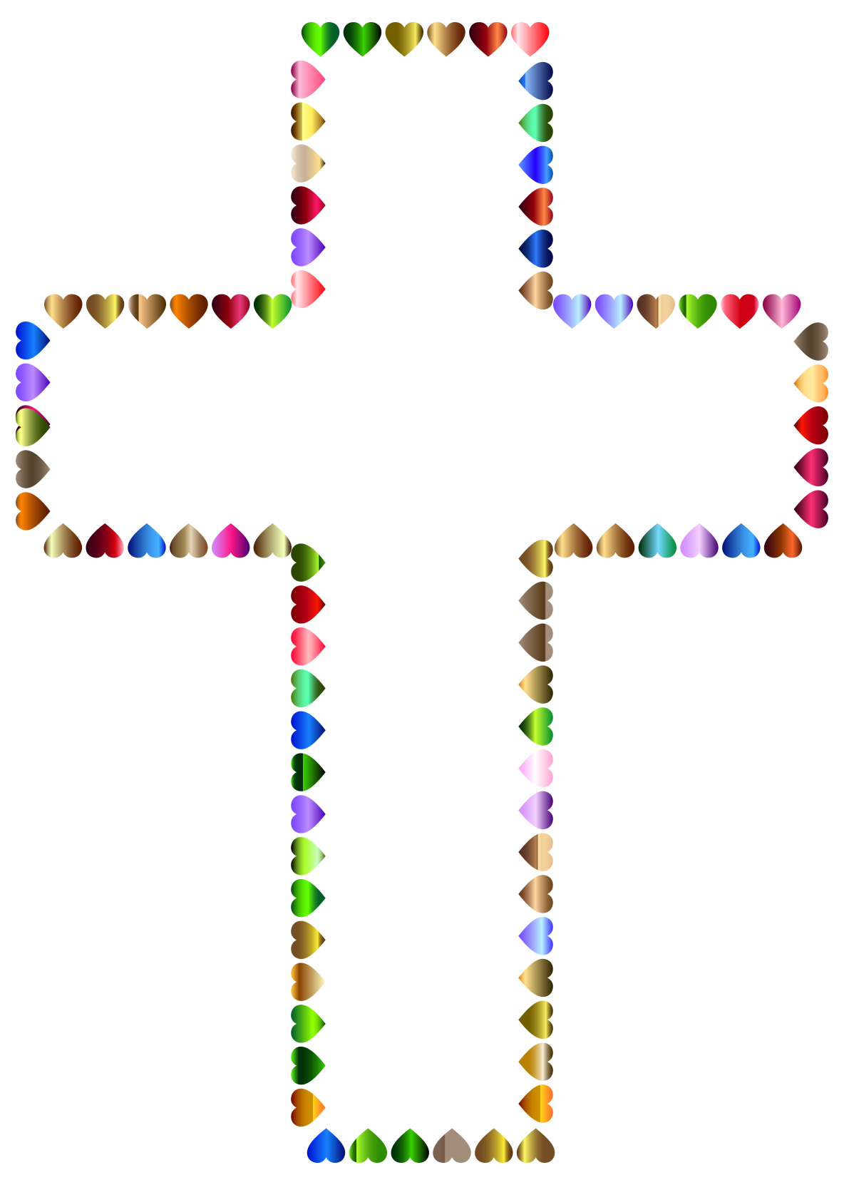 This features a large, colorful cross made up of various colored hearts. These hearts are arranged in a pattern that resembles the shape of a cross, with each heart being uniquely shaped and sized. The hearts come in a variety of colors, including pink, green, yellow, blue, orange, purple, and red. The combination of these vibrant colors creates an eye-catching and visually appealing display that showcases the creativity behind this artistic piece.