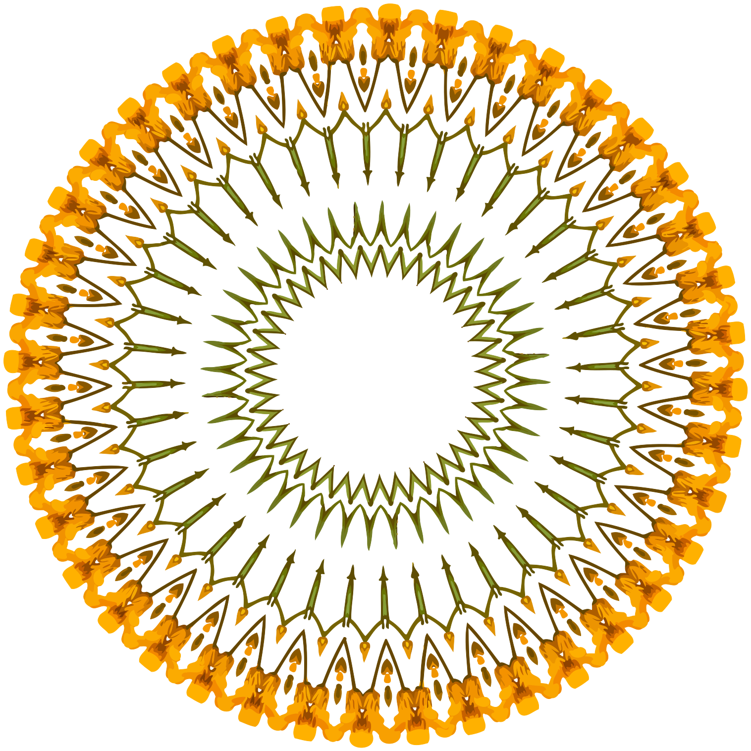 This features a large, circular design made up of numerous yellow flowers. These flowers are arranged in an intricate pattern that creates the illusion of a rotational symmetry. The design is composed of various shapes and sizes of flowers, creating a visually appealing and complex pattern. The overall effect is one of beauty and harmony, with each flower contributing to the larger composition.