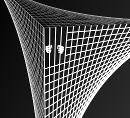This features a unique and intriguing design of a jail cell made out of white bars. Two hands are holding the bars, creating an interesting visual effect. The background is black, which contrasts with the white bars and hands, making them stand out even more. This artistic representation of a jail cell adds a creative twist to the traditional concept of incarceration.