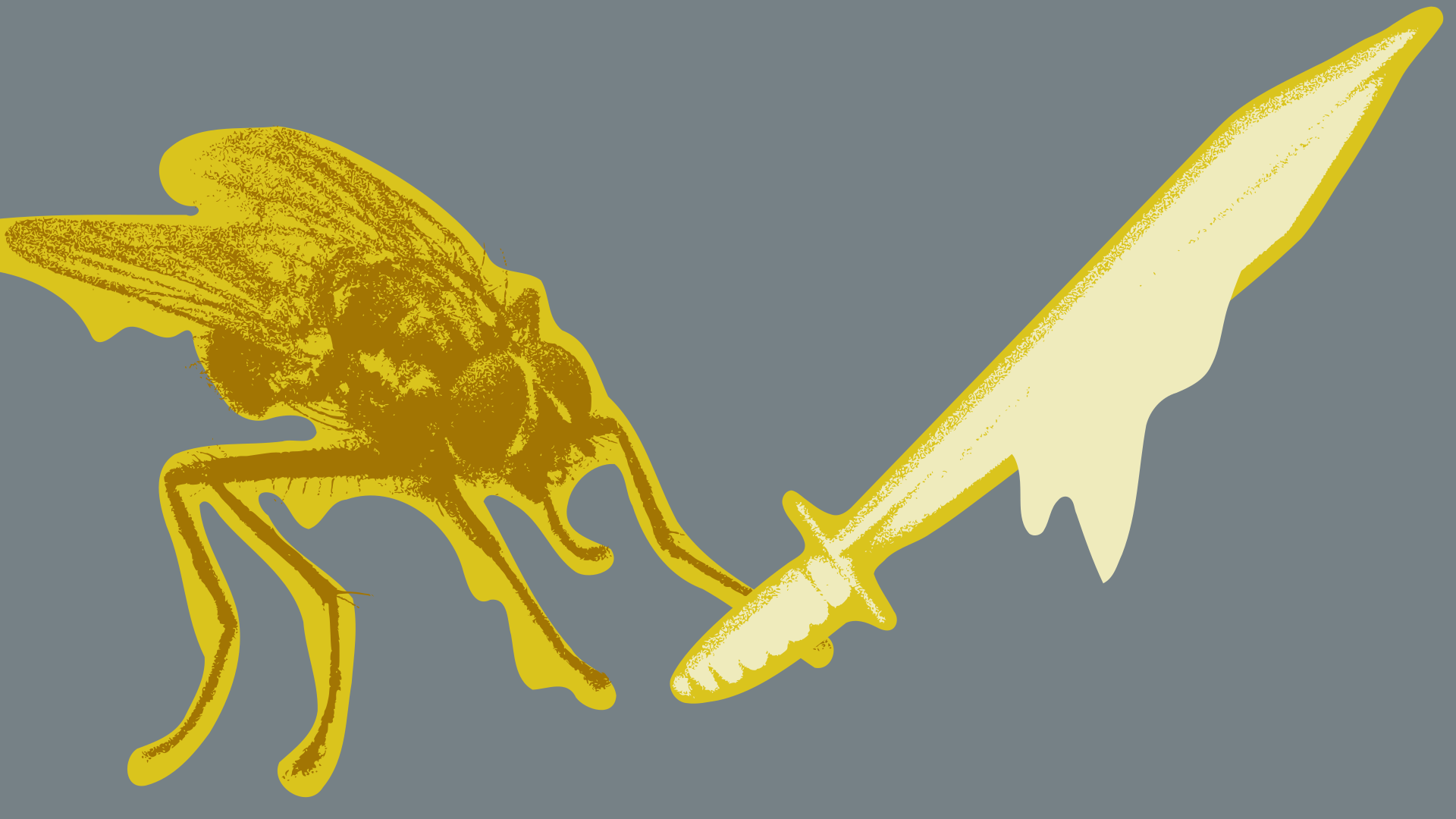 This features a large, yellow insect with long legs and antennae. It appears to be an ant or a similar type of creature. In the background, there is a sword that seems to be made out of plastic or another lightweight material. The sword's handle is located near the top right corner of the image, while its blade extends horizontally across the scene. This unusual combination of elements creates an interesting and intriguing visual composition.
