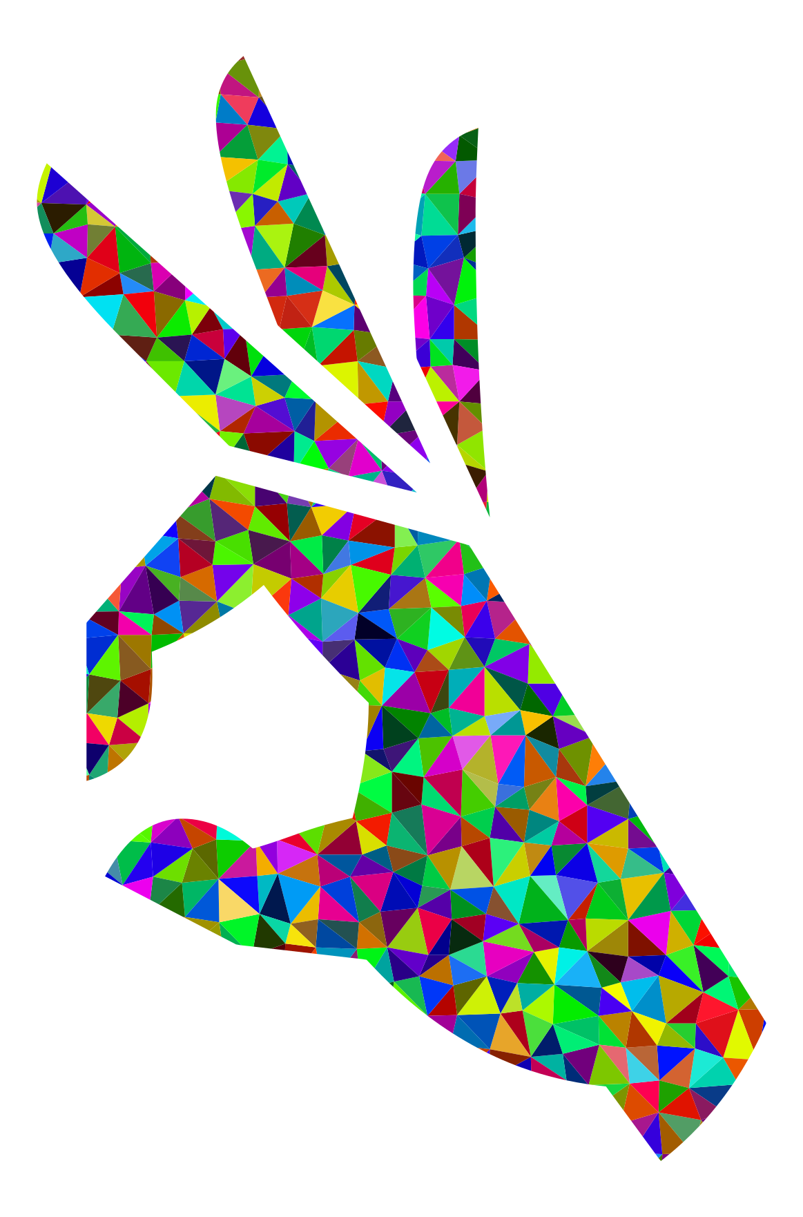 This features a colorful hand with a thumb and index finger, both pointing upwards. The hand is made of various colored triangles that create an eye-catching pattern. The colors used in the design include red, green, blue, yellow, purple, orange, and pink. This unique artwork gives off a vibrant and lively atmosphere, making it an interesting visual piece.