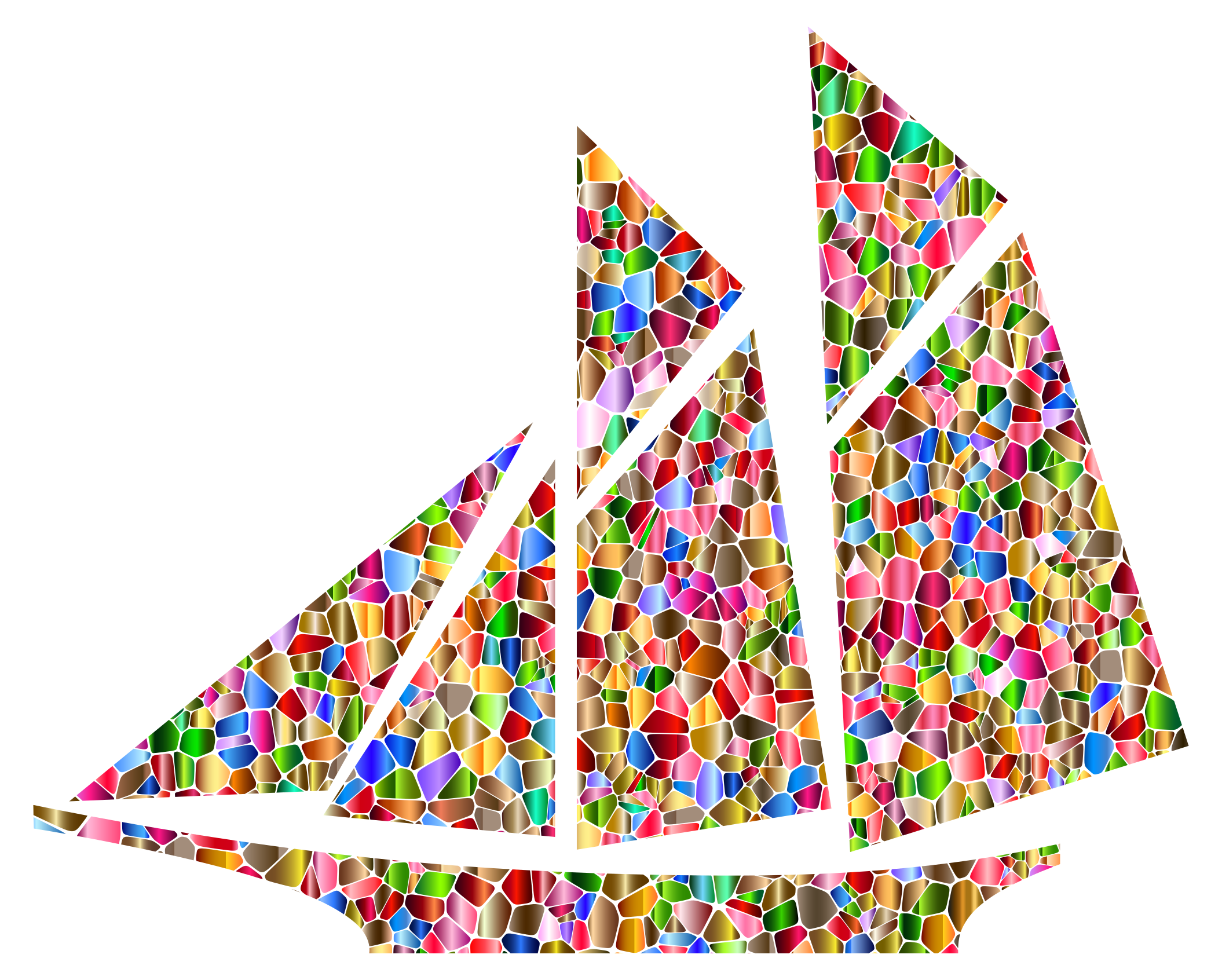 This features a large, colorful sailboat with a multitude of colors on it. It is adorned with various shades and hues that create an eye-catching visual effect. The boat's sails are made up of many small pieces, each one contributing to the overall vibrant appearance. This unique design makes the sailboat stand out as a striking piece of artwork or decoration.
