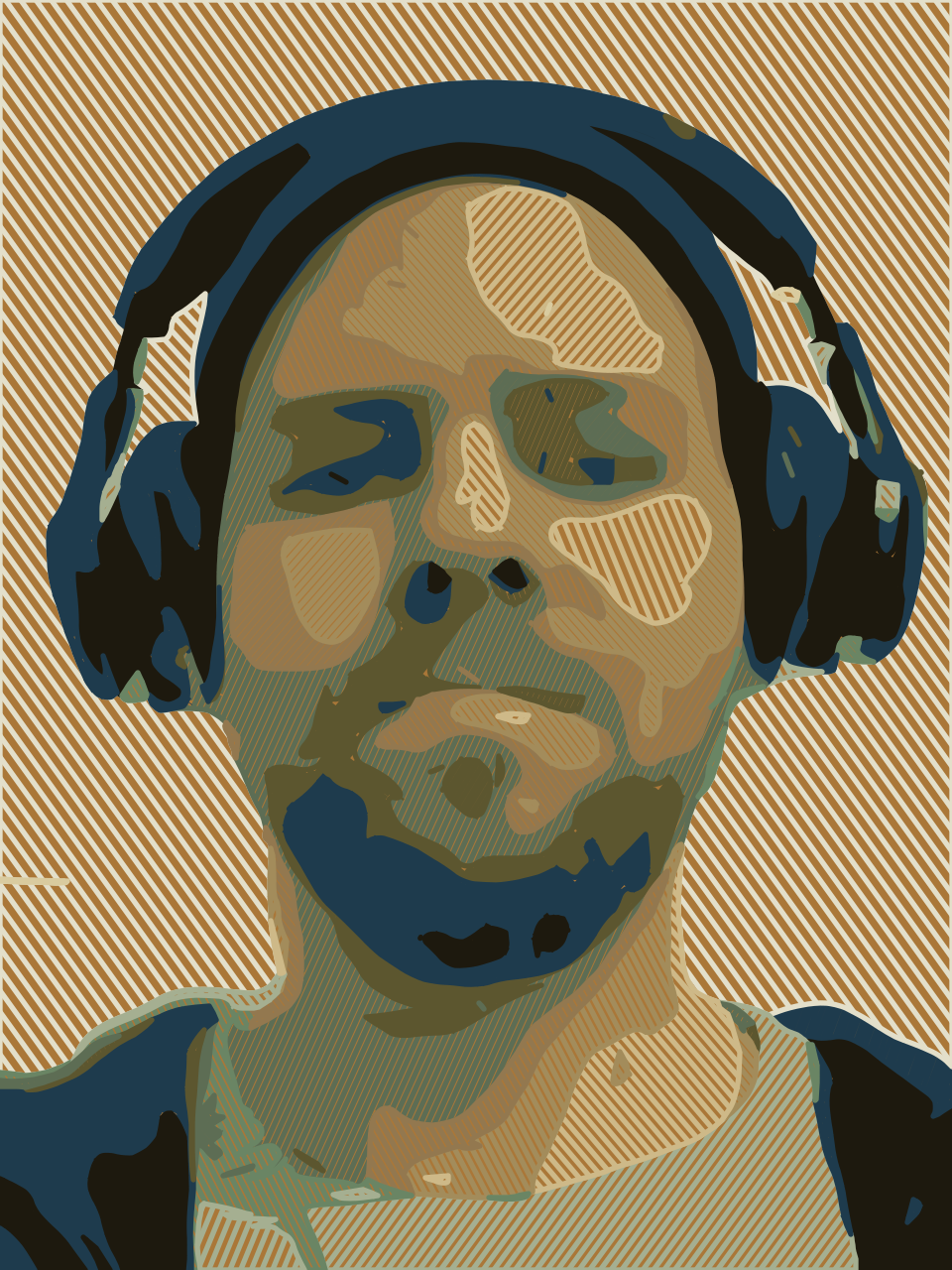 This features a man wearing headphones, with his face prominently displayed. He has a short beard and appears to be looking at the camera. The man is wearing black headphones, which are clearly visible on his ears. The overall appearance of the photo gives it an artistic touch, possibly due to its coloration or unique presentation.