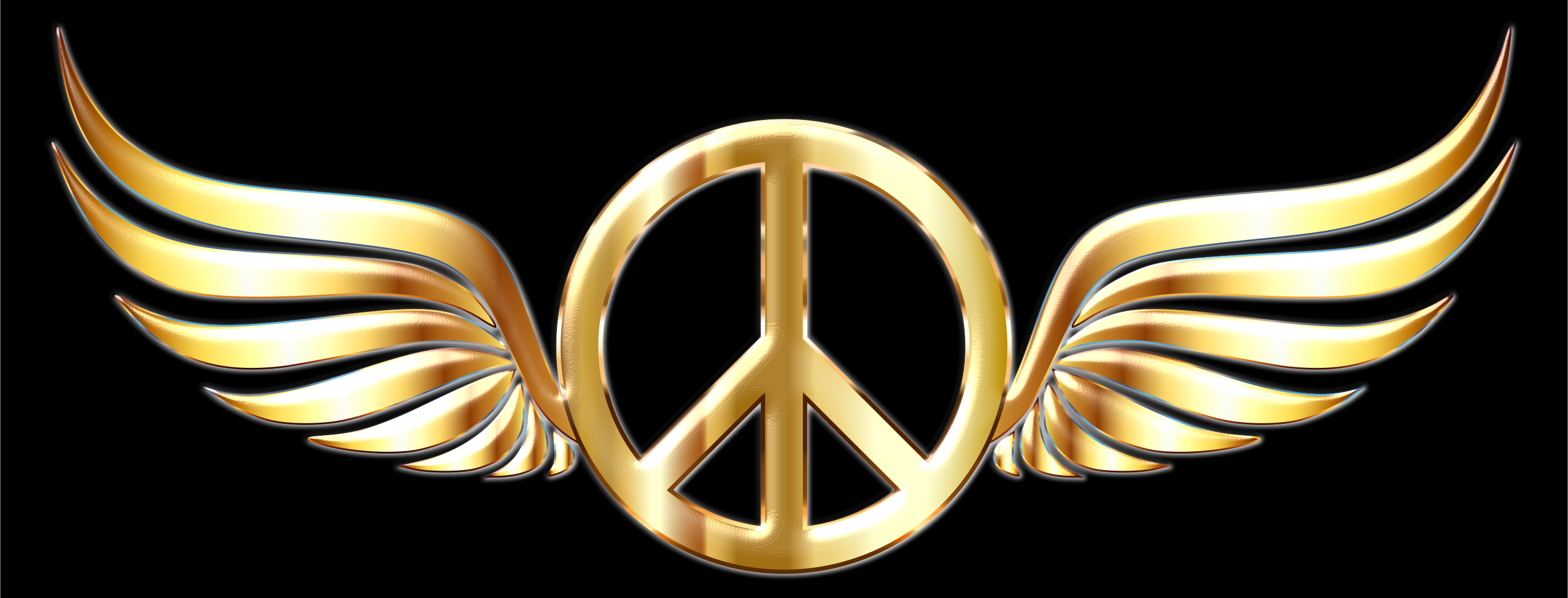 This features a peace sign, which is an emblem of harmony and unity. It is adorned with gold wings on either side, giving it a celestial appearance. The peace sign itself has a golden hue, further enhancing its visual appeal. This symbolic representation of peace is displayed prominently in the image, making it a powerful and inspiring focal point.