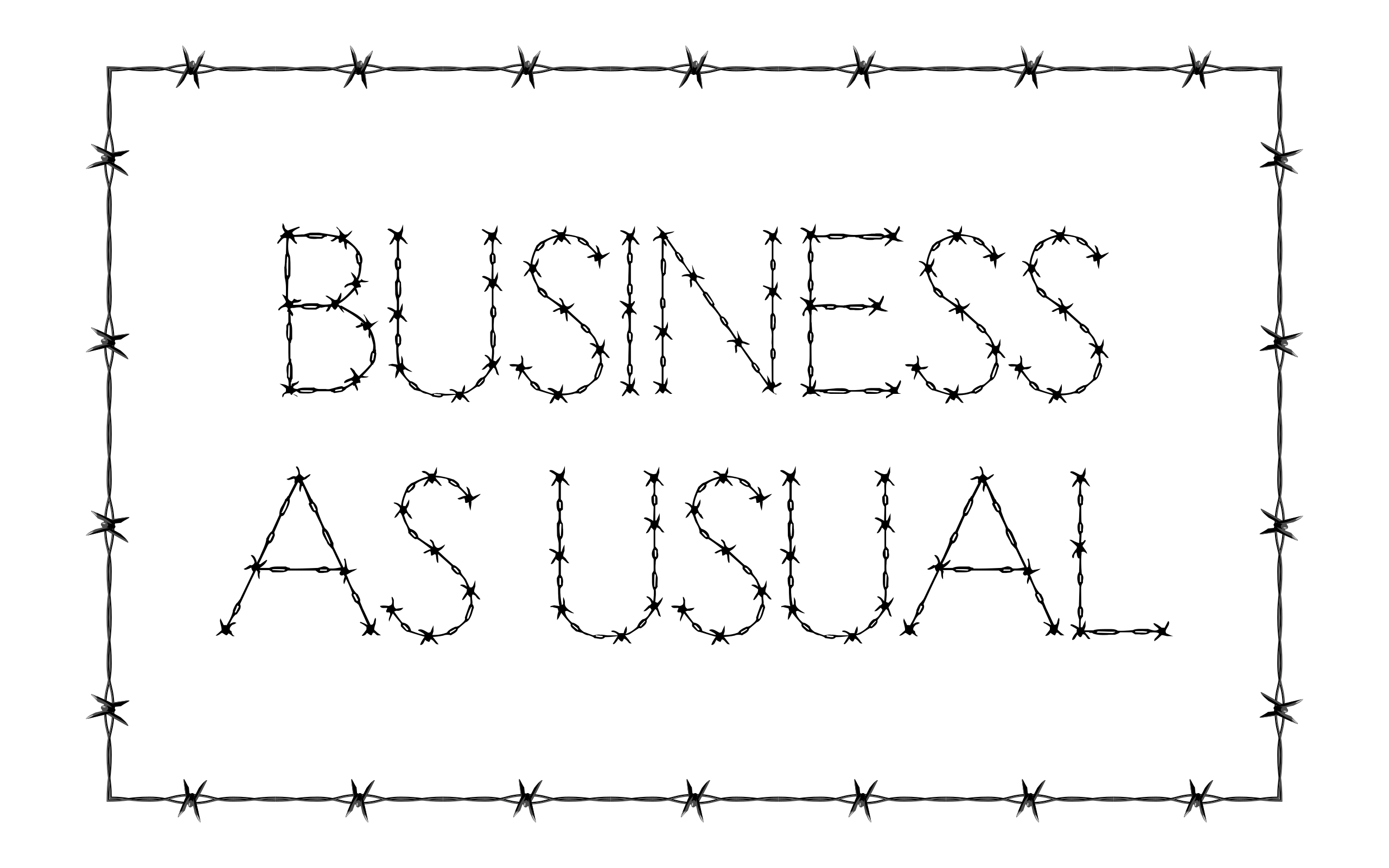 This features a sign that reads "Business as usual" in black lettering. The letters are arranged in a way that they appear to be made of small dots, giving the impression of a handwritten or stylized appearance. This unique design adds an artistic touch to the sign's message, which is likely meant to convey a sense of continuity and normalcy despite any potential disruptions or challenges in the business world. The sign could be used as a decorative piece or placed on a wall to communicate this idea to those who pass by.