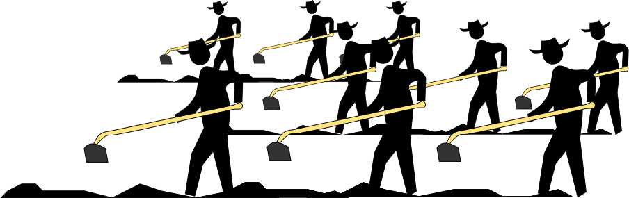 This features a group of men working together to move a large object, possibly a barrel or a large rock. There are nine people in total, all wearing cowboy hats and carrying pickaxes. They appear to be coordinating their efforts to move the heavy item across a dirt field. Each person is positioned at different angles and distances from one another, indicating that they are working as a team. The men's positions suggest that they are moving in unison, with some individuals leading the way while others follow closely behind.
