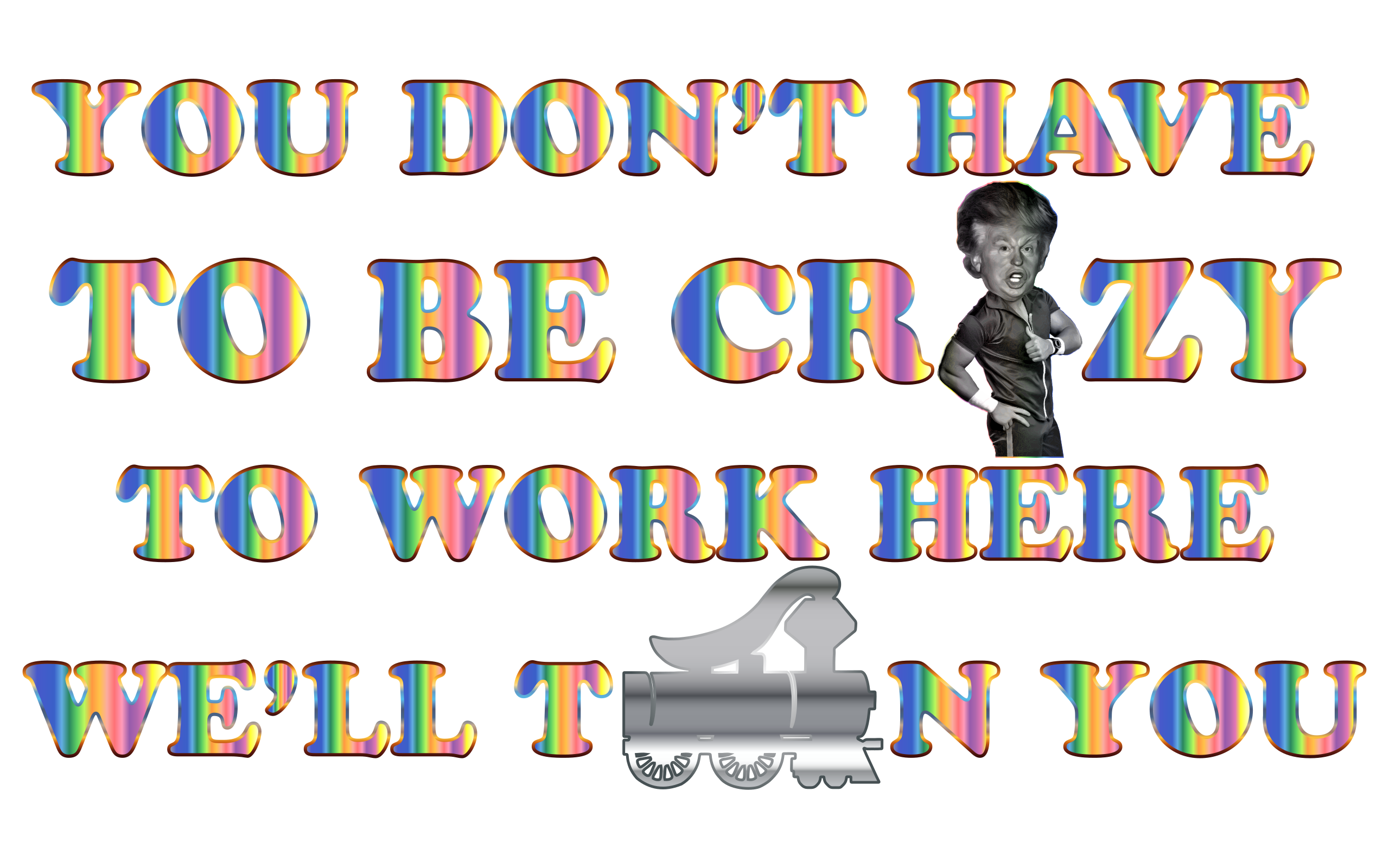 Tags: caricature, chromatic, colorful, donald trump, funny, grayscale, humor, joke, laugh, parody, prismatic, psychedelic, railroad, rainbow, satire, text, train, type, typography, word, you don't have to be crazy, to work here. we'll help you get there., text colorful