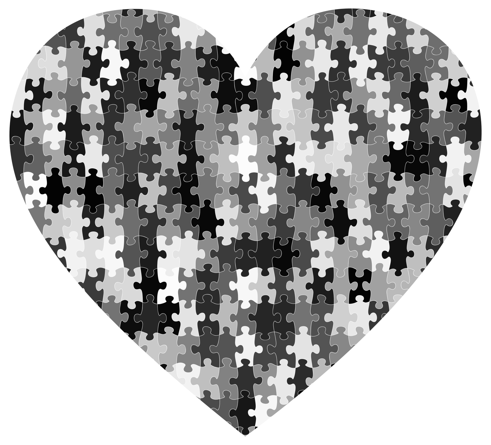 This features a heart-shaped design made up of various puzzle pieces. These puzzle pieces are arranged in such a way that they form the shape of a heart, with each piece having different shades of white, gray, and black. The puzzle pieces are scattered throughout the entirety of the heart, creating an intricate and visually appealing pattern. This unique design showcases creativity and artistic expression through the use of everyday objects like puzzle pieces to create a beautiful and eye-catching image.