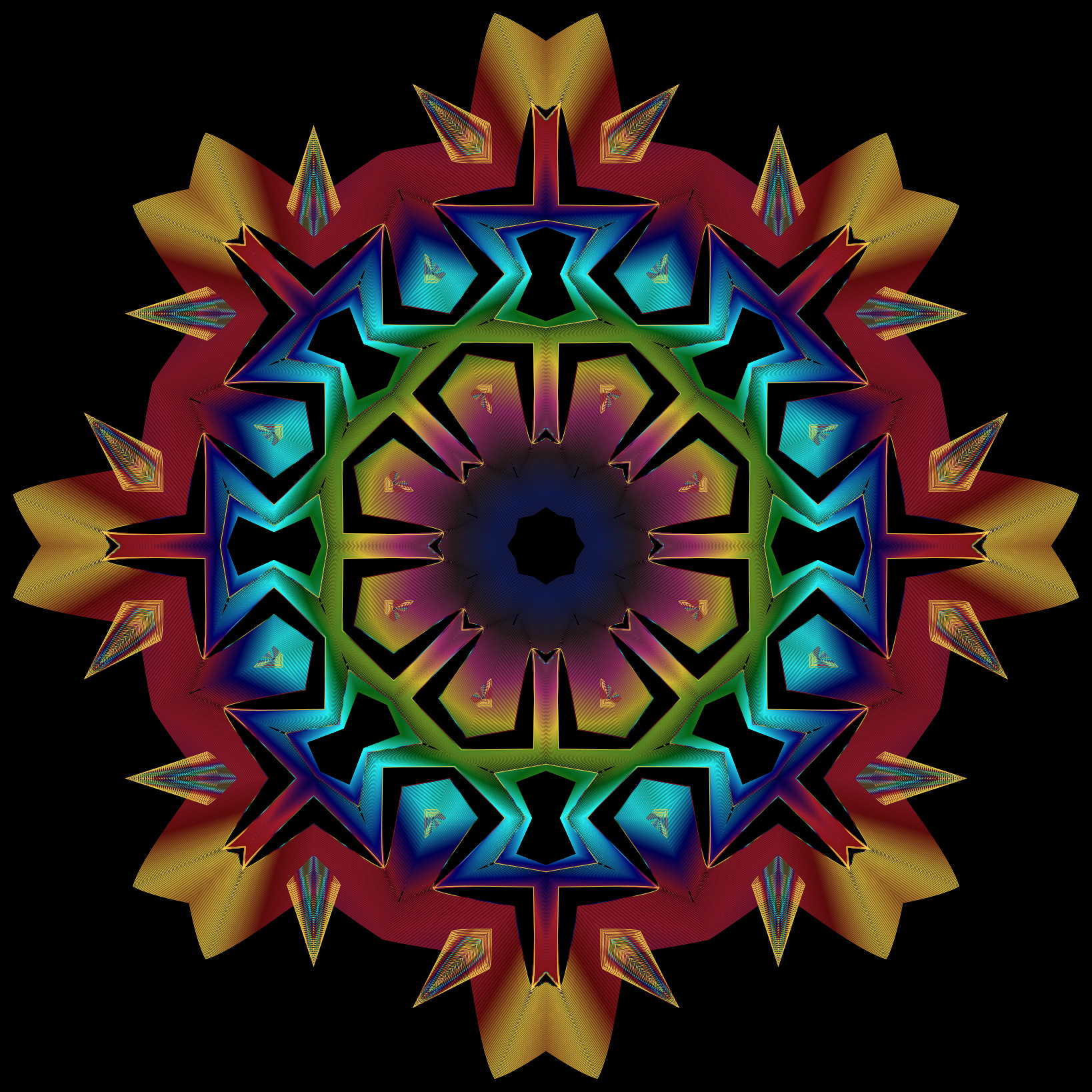 This features a large, colorful, and intricate design that resembles a flower in the center of a star. The star is made up of many points, each one varying in color from yellow to blue, creating an eye-catching pattern. The overall effect is a vibrant and captivating piece of artwork that showcases the artist's skill in combining different colors and shapes into a cohesive design.