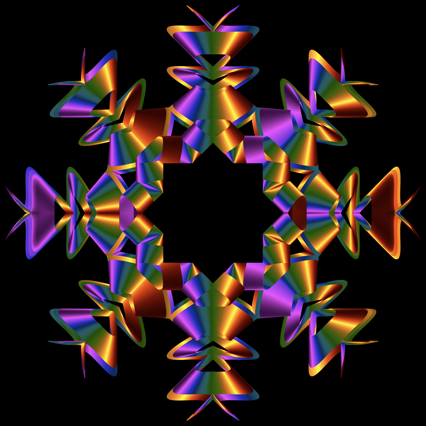 This features a colorful, geometric design that resembles a star. It is composed of multiple triangles and circles arranged in an intricate pattern. The colors used in the design are predominantly purple and orange, creating a visually striking contrast against the black background. The star has eight points, making it a unique and eye-catching piece of artwork.