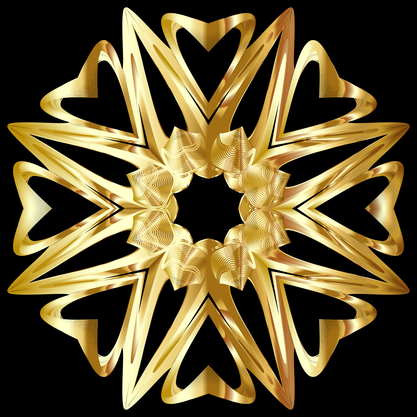 This features a large, intricate design made up of interconnected golden stars. These stars are arranged in such a way that they form a central point or heart shape, with each star point connected to the others by curved lines. The overall effect is an elegant and visually striking pattern that showcases the beauty of the gold material used for its creation. The design appears to be both complex and harmonious, making it an impressive piece of art or decoration.
