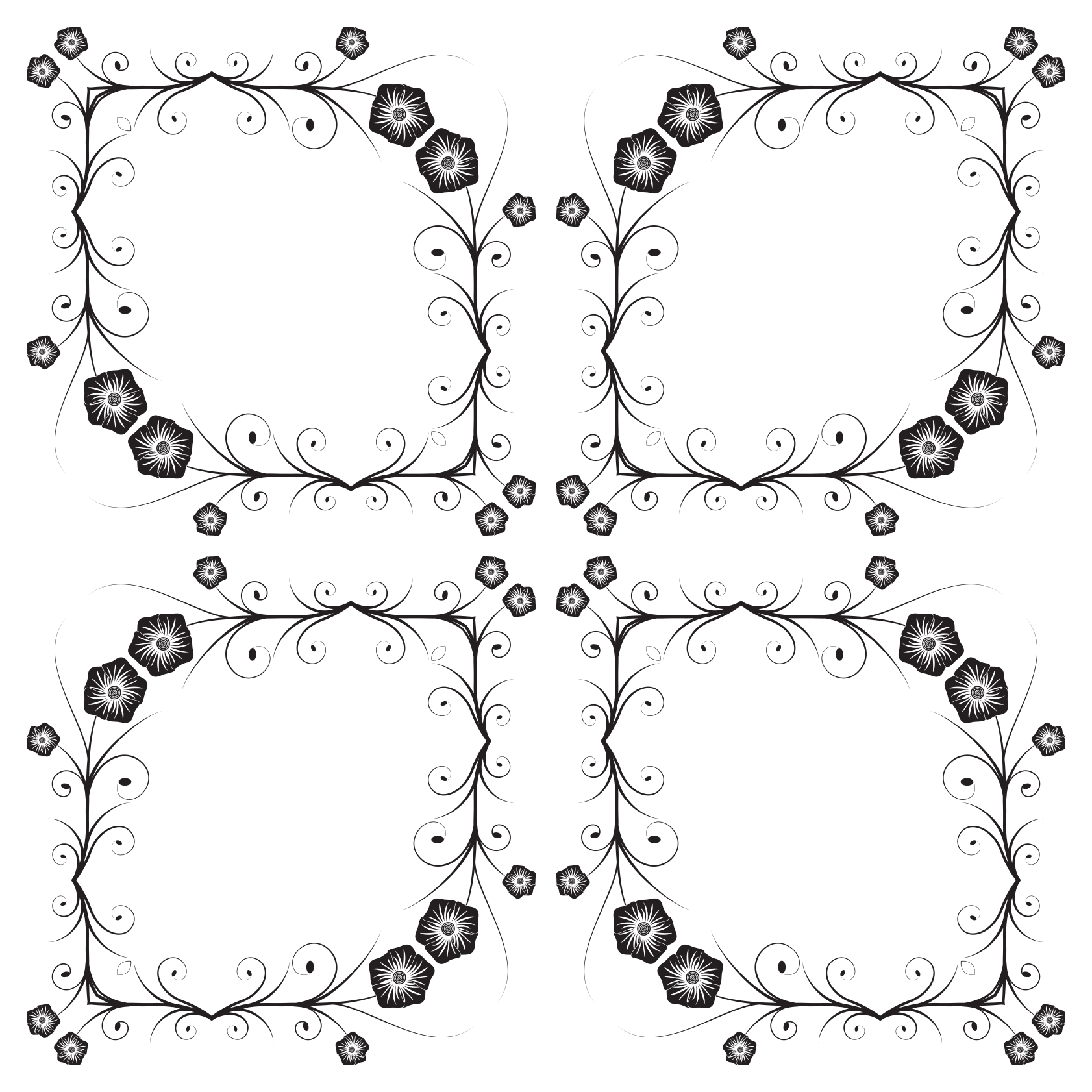 This features a black and white design with a floral pattern. There are four distinct circles in the center of the design, each surrounded by an intricate border of swirls and flowers. These circles appear to be empty spaces, possibly meant for writing or drawing. The overall composition creates a visually appealing and elegant appearance.