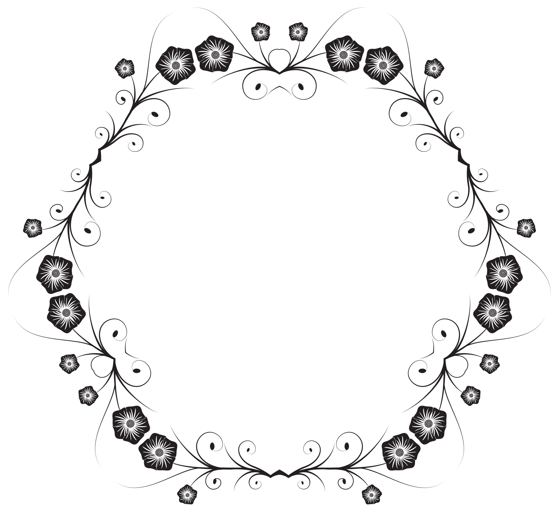 This features a round, floral design with twelve larger flowers and twelve smaller ones. These intricate patterns are intertwined to create an elegant border around the circle. The flowers have a gray color, which adds depth and sophistication to the overall design. This artwork could be used as a decorative element or even as a part of a larger project that incorporates floral motifs.