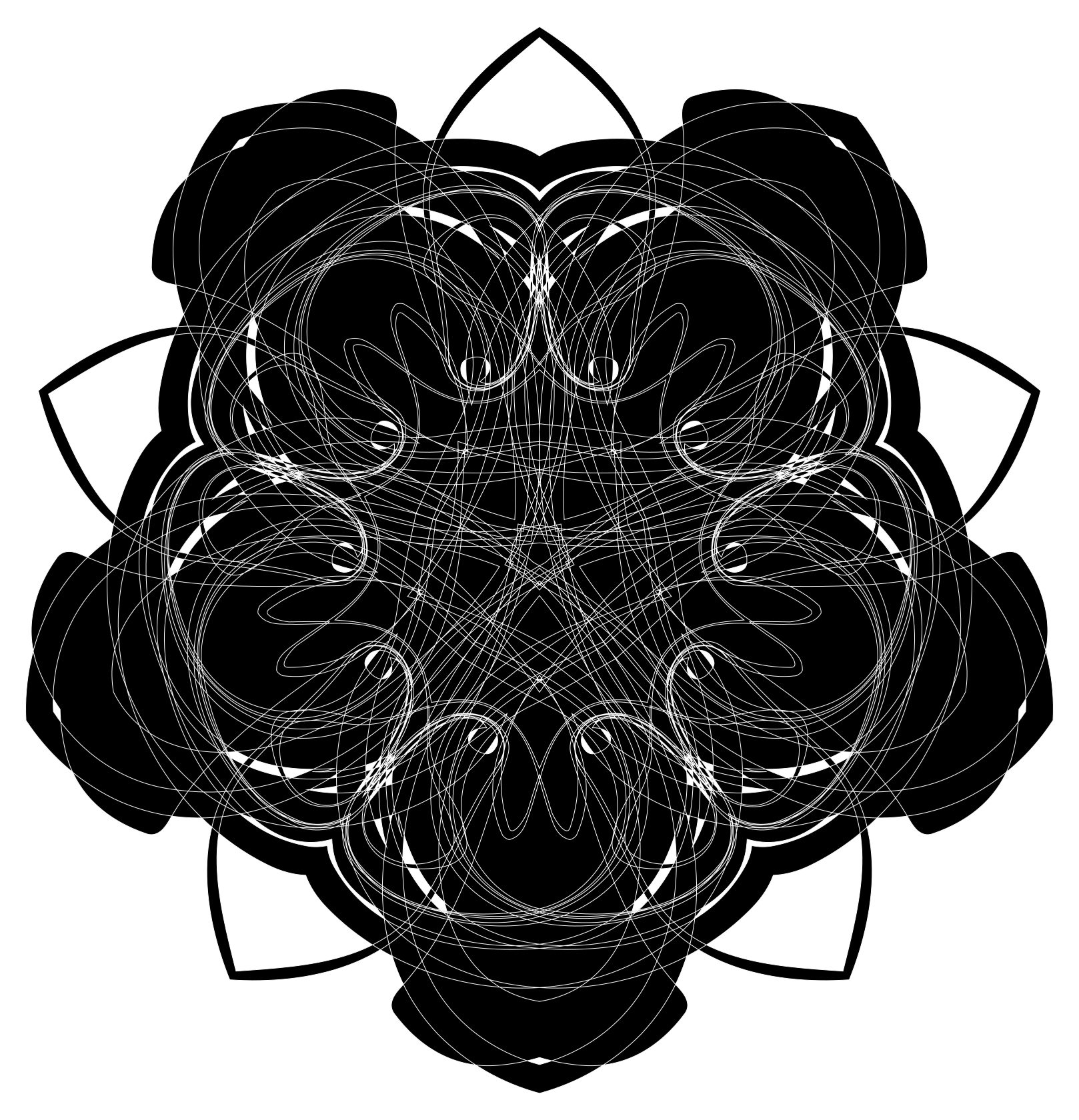 This is a black and white drawing of an intricate design, resembling a flower or a pattern. It features multiple circles arranged in various positions, creating a complex and visually appealing composition. The overall effect is that of a dark abstract floral design, with ten edges visible throughout the piece. This artwork showcases the artist's skill in crafting an intricate and captivating visual experience through simple shapes and lines.