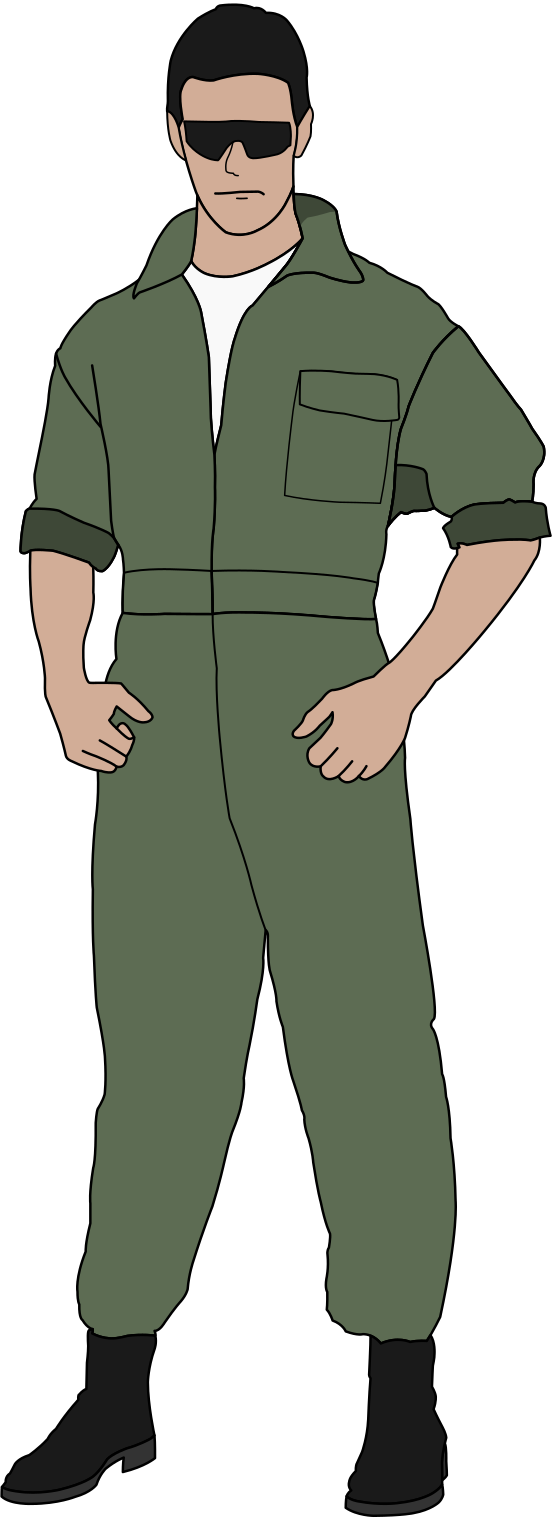 This features a man dressed in military fatigues, standing with his hands on his hips. He is wearing sunglasses and has a confident pose. His uniform consists of green pants and a matching jacket, giving him an air of authority. The man's attire suggests that he might be a fighter pilot or part of the military.