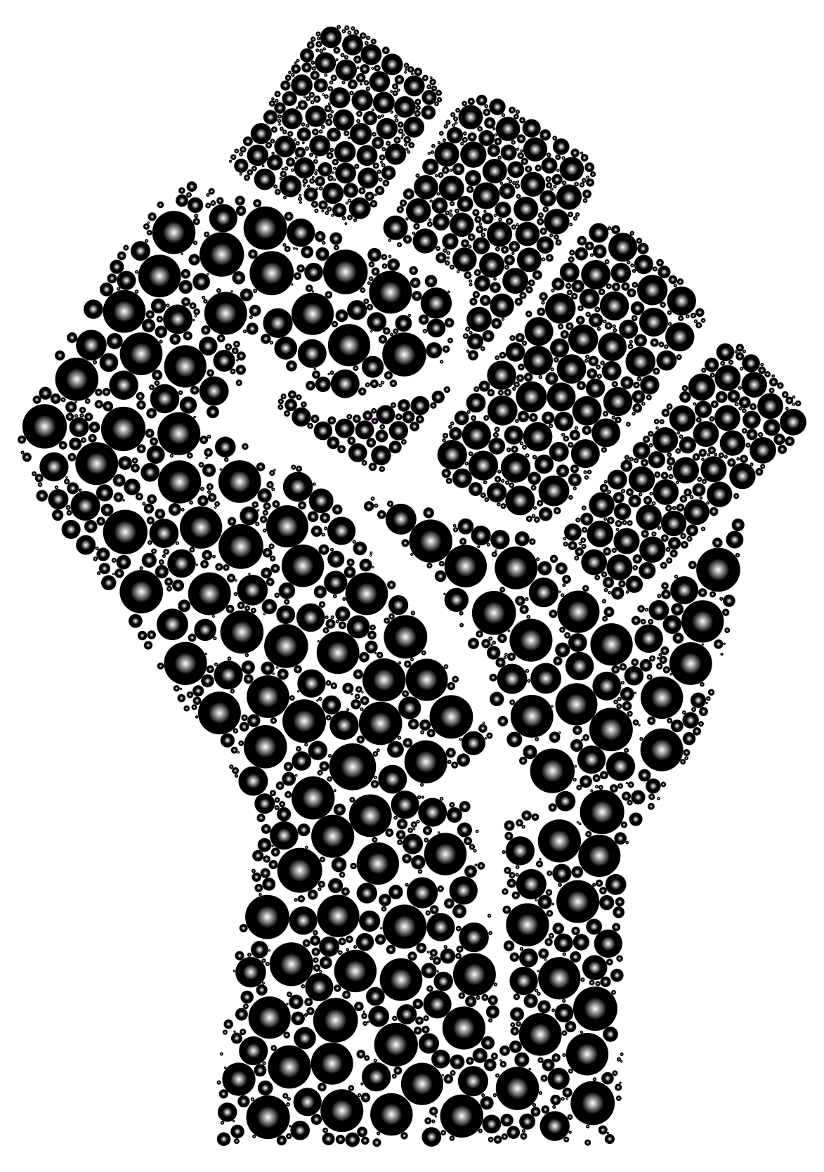 This features a large, close-up of a fist with the fingers spread out. This fist is made up of many small circles that are arranged in such a way as to create the appearance of a hand. These circles are scattered all over the fist, filling it from top to bottom and side to side. The overall effect is an interesting and unique representation of a human hand using only circles.