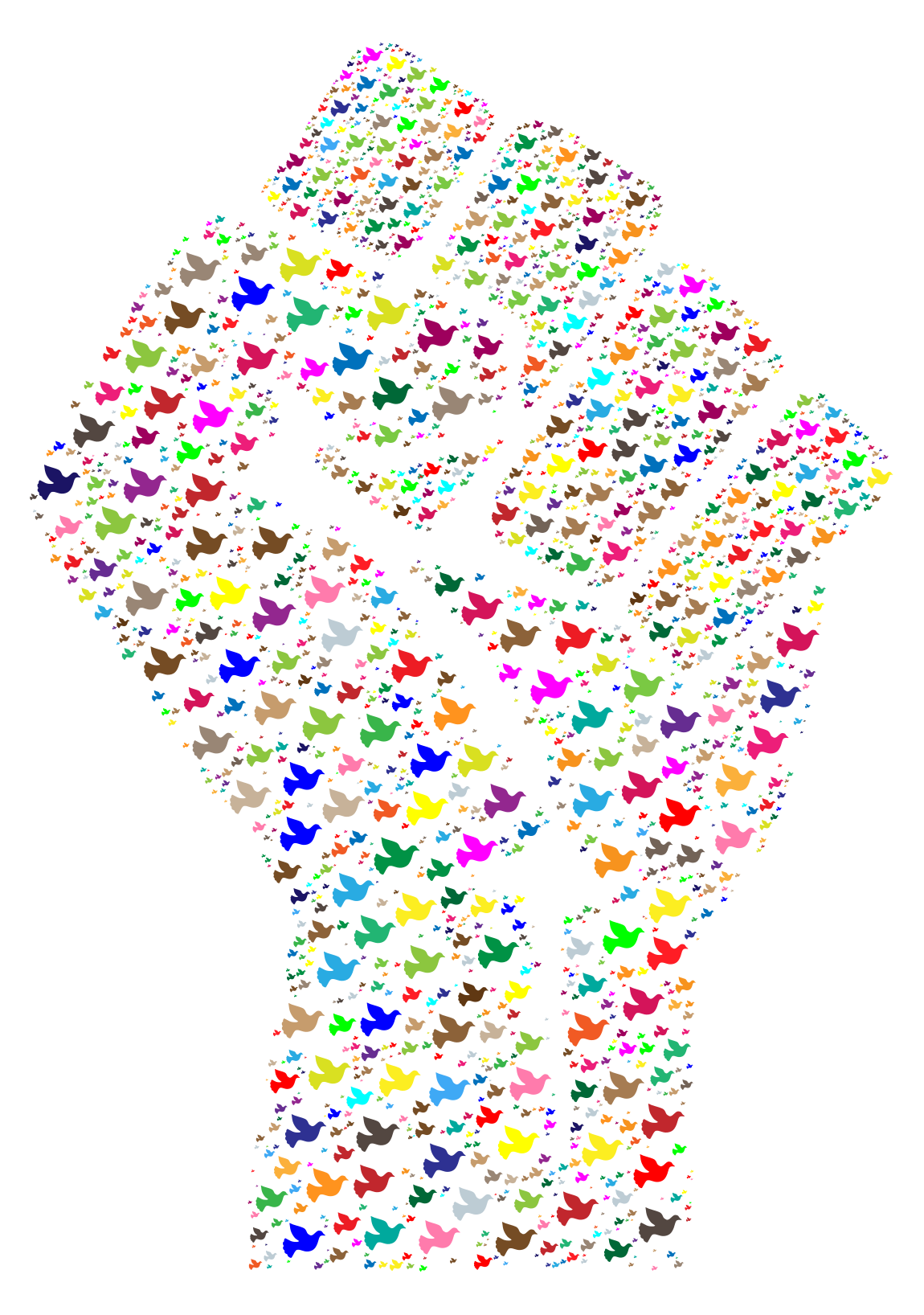 This features a large fist made up of many small birds. These birds are scattered all over the fist, creating a visually striking and unique design. There is an array of different colored birds, each one adding to the vibrant and lively atmosphere of the scene. The combination of the fist and the birds creates a powerful symbol that can be interpreted in various ways depending on the viewer's perspective.