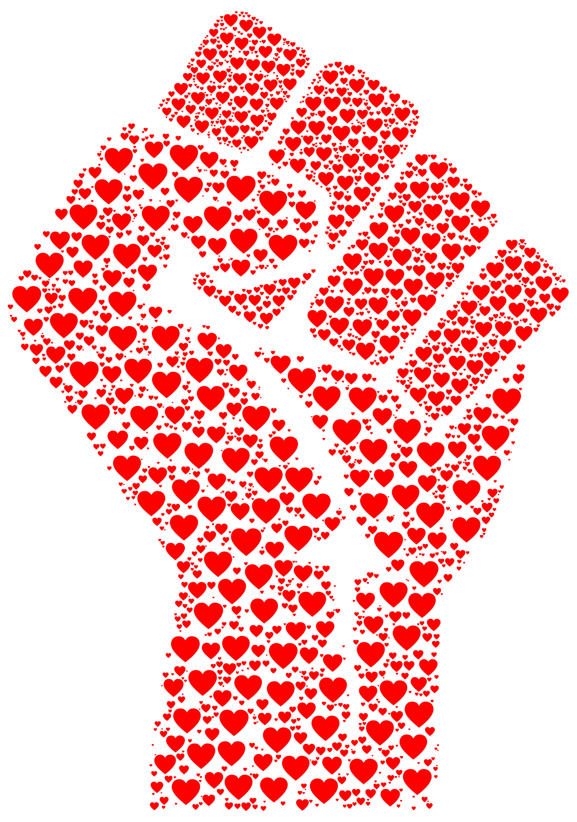 This features a red fist with hearts surrounding it, creating an eye-catching and unique design. The hearts are scattered all around the fist in various sizes and positions, adding depth and interest to the overall composition. This creative display of hearts on the fist symbolizes love and unity, making for a powerful visual statement.