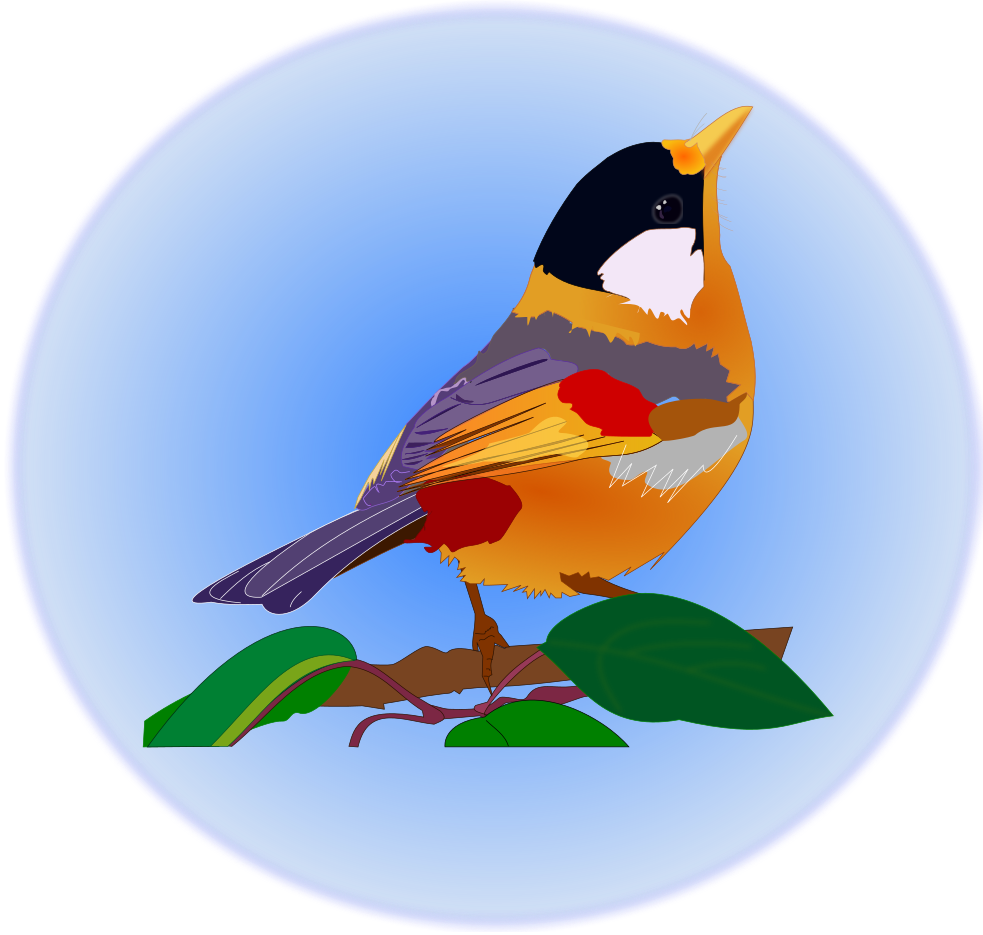 This features a colorful bird with an orange and black body, perched on top of a leaf. It appears to be looking upwards, possibly observing its surroundings or searching for food. The bird's vibrant colors make it stand out against the backdrop of the leaf, creating a visually appealing scene. This illustration showcases the beauty and diversity found in nature, with the bird being an example of the many different species that inhabit our planet.