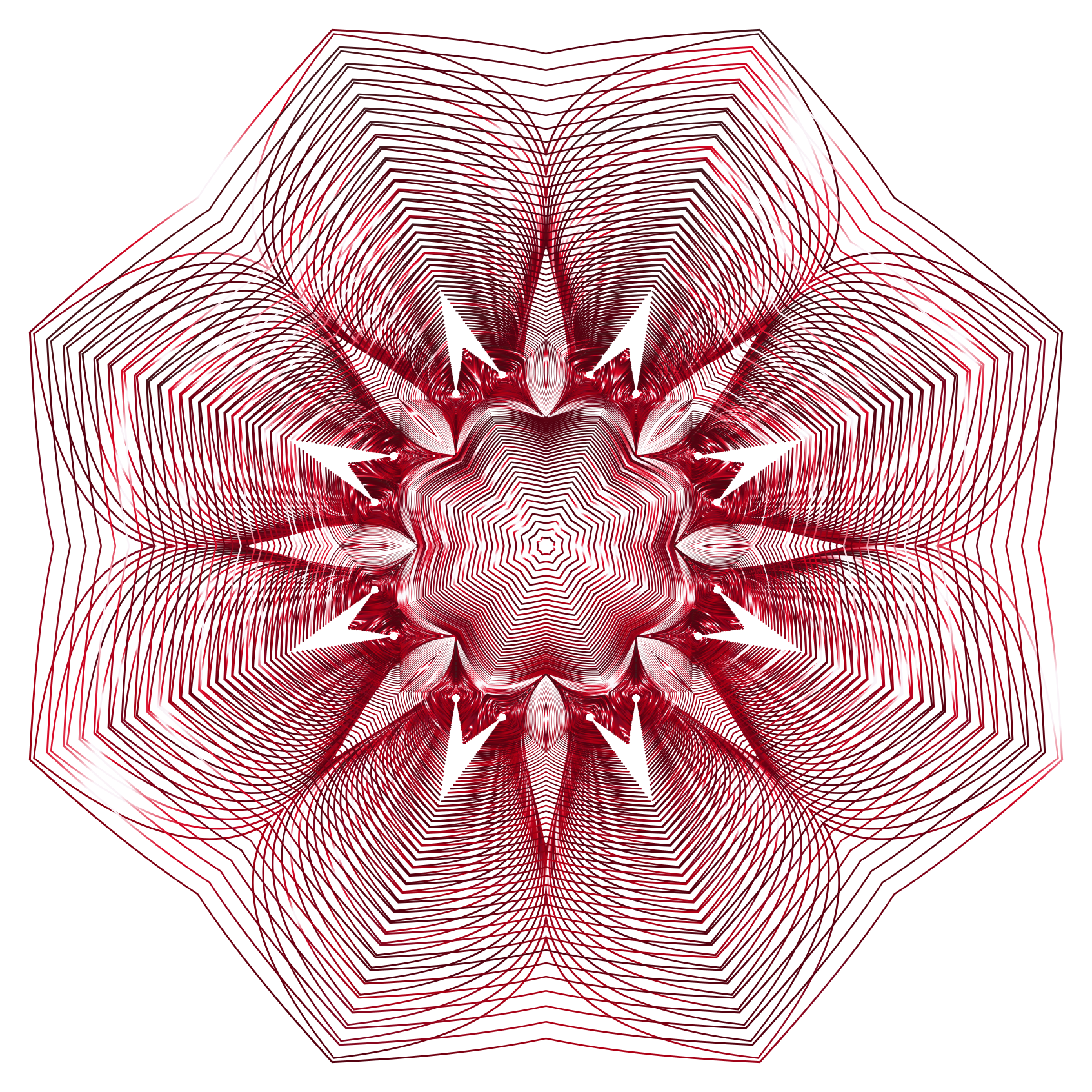 This features a large, intricate design that resembles an abstract flower. This flower has eight petals, each made up of lines and arranged in a circular pattern. The entire composition is red in color, giving it a vibrant and eye-catching appearance. The design appears to be composed of many smaller shapes or elements, creating a complex and visually engaging piece that captures the viewer's attention.