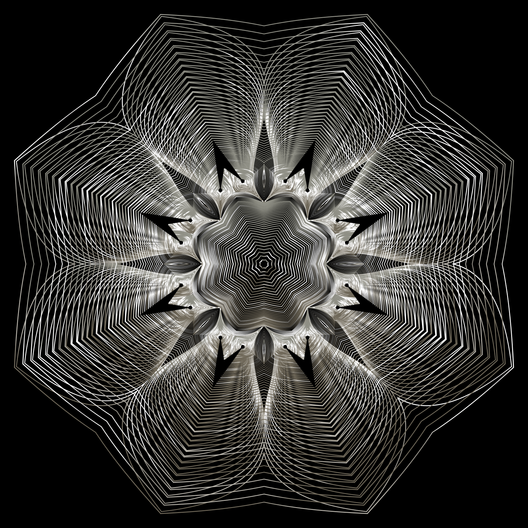 This is a close-up of an intricate, geometric design that resembles a flower. It features a central point surrounded by multiple lines and shapes, creating a visually captivating pattern. The design appears to be made up of interconnected circles, with some overlapping each other in various positions. This artistic piece showcases the artist's skillful use of lines and shapes to create an eye-catching and unique visual experience.