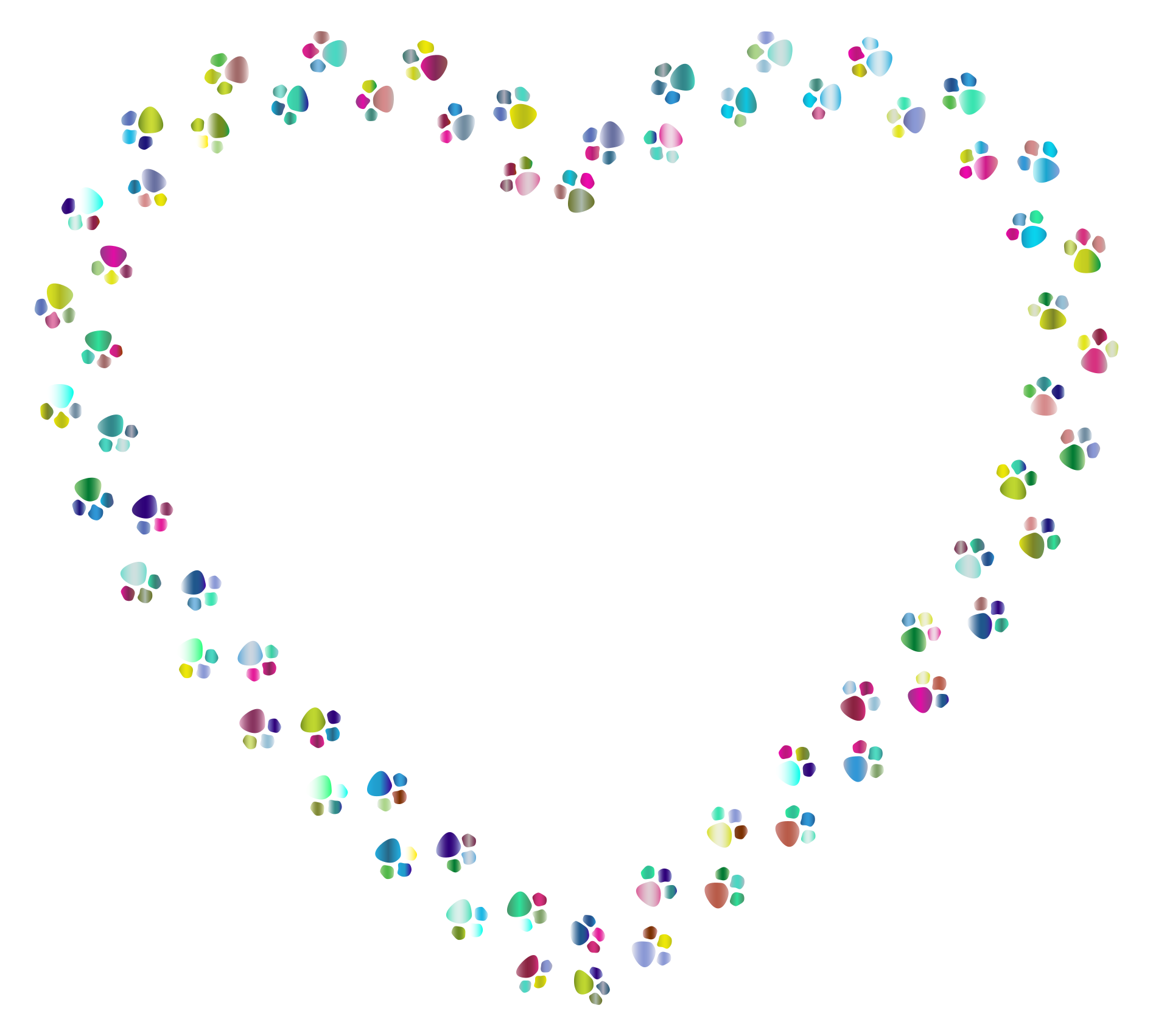 This features a heart-shaped illustration made up of small, colorful paw prints. These paw prints are scattered all over the heart, creating a visually appealing and playful design. The colors used in this artwork include various shades of green, yellow, blue, red, purple, orange, and white. This unique representation of a heart is both creative and eye-catching, making it an interesting piece of art or decoration for any space.
