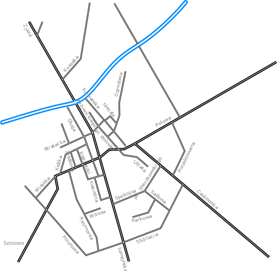 This is a map of Stawiska, Poland. It shows the streets and roads in the area, with some buildings visible on the map as well. The streets are labeled with names such as "Sosnowa," "Parkowska," and "Kazimierzowska." The map also features a blue river running through the city, adding to its overall visual appeal.