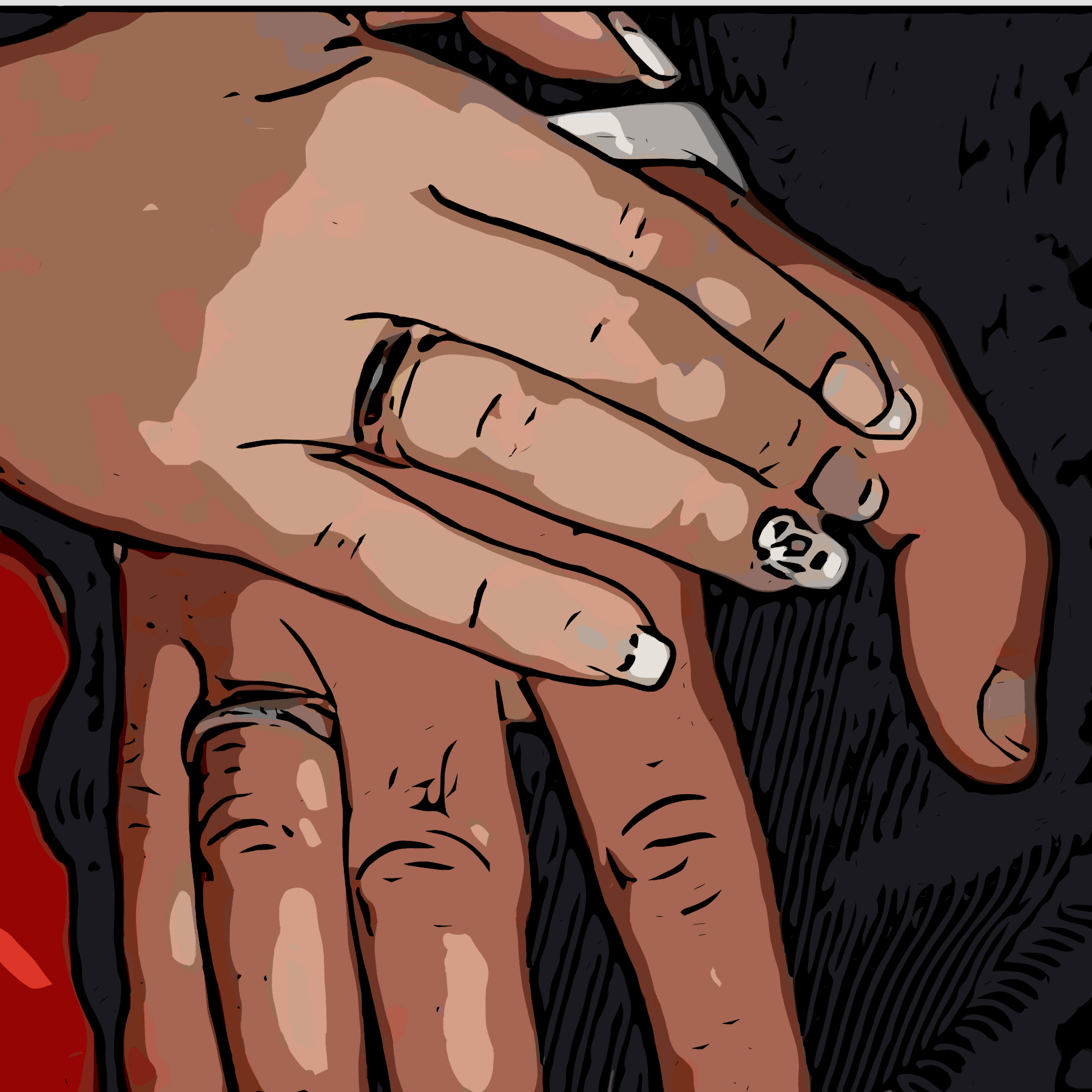 This is a black and white illustration of a married couple holding hands. They are both wearing rings on their fingers, with one ring being larger than the other. The man's hand is placed over the woman's hand, creating an intimate and loving scene. The illustration captures the essence of marriage and the bond between the two individuals.