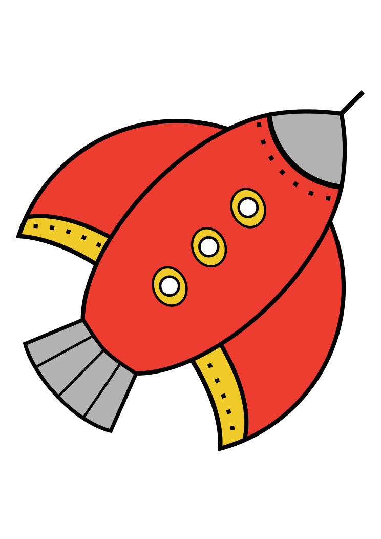 This features a colorful rocket ship with red wings and gold accents. It has three windows on the side, adding to its unique design. The rocket is positioned in the center of the scene, making it the focal point of the illustration. The combination of red, gold, and white colors creates an eye-catching and vibrant appearance that makes this rocket ship stand out.