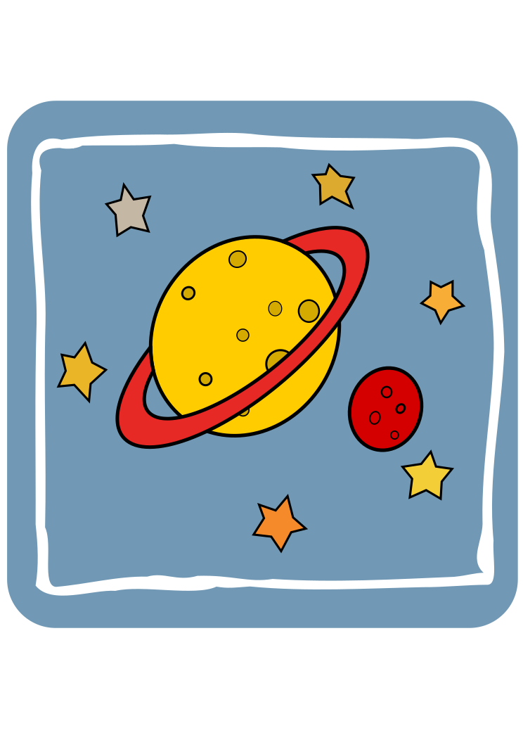 This features a colorful illustration of outer space with a blue background. In the center, there is a yellow planet with a red ring around it, which appears to be the main focus of the scene. Next to this large planet, there is a small red planet with several craters on its surface. Both planets are surrounded by numerous stars, creating an interesting and visually appealing representation of our solar system. The combination of bright colors and intricate details makes this illustration both engaging and informative for viewers interested in space exploration.
