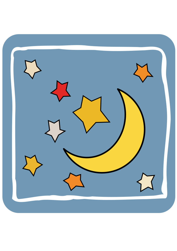 This features a blue square with a yellow crescent moon in the center. Surrounding the moon are various stars, each in different shades of red, orange, and yellow. These stars create an interesting and colorful pattern that adds visual interest to the overall design. The combination of the blue background and the vibrant colors of the stars make this illustration a captivating piece of artwork.
