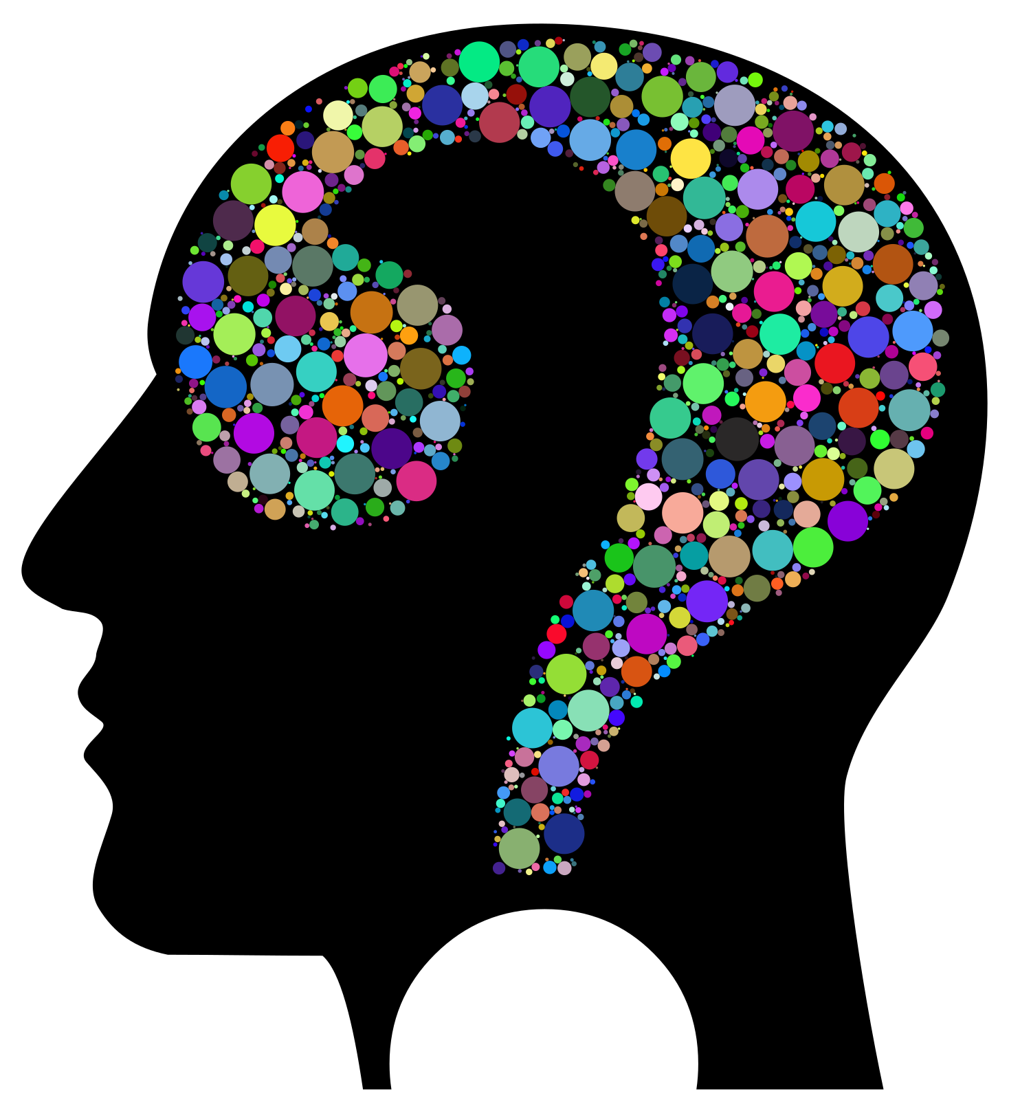 This features a black and white drawing of a human head with a colorful floral design on the brain. The head is shown from the side, giving an interesting perspective on this part of the body. The brain itself has a question mark shape, adding to its unique appearance. The overall composition of the image creates a visually engaging piece that captures attention and sparks curiosity about the subject matter.